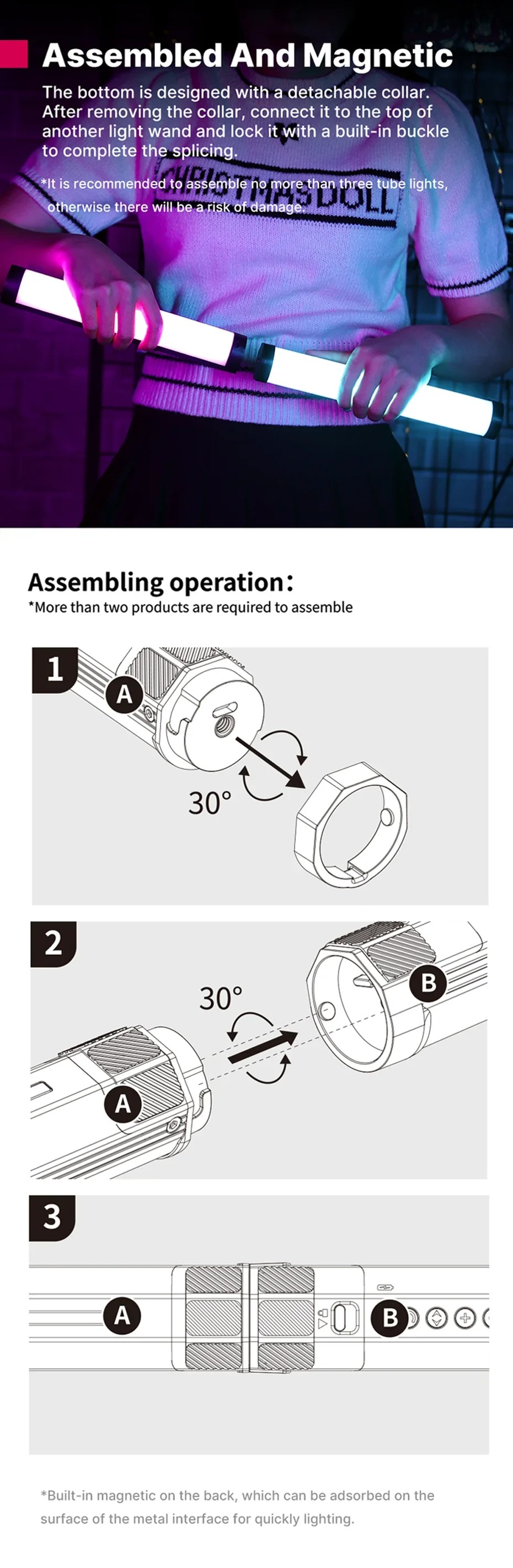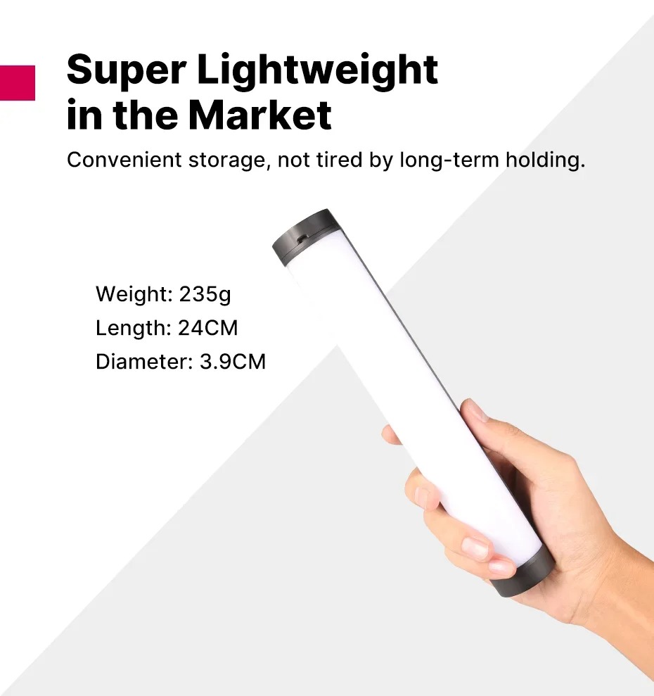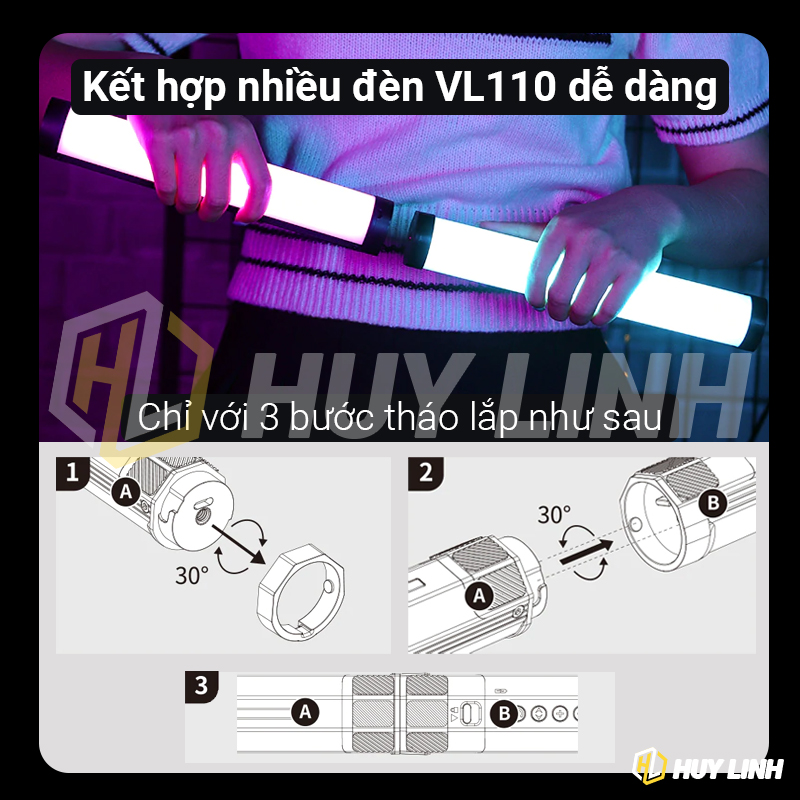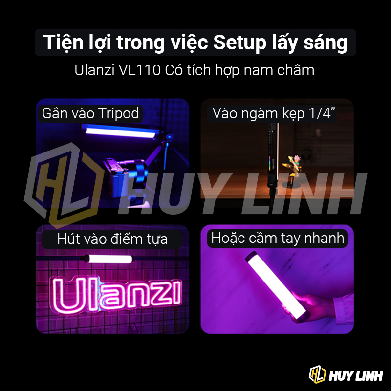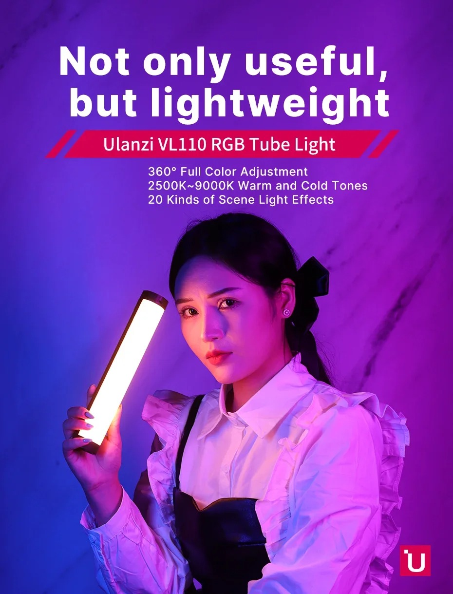 Đèn led RGB Ulanzi VL110 cũng là đèn led dạng ống như đèn Ulanzi i-Light nhưng có kích thước dài hơn với 24cm, có thể nối nhiều đèn lại để tăng độ dài tùy theo nhu cầu. Đèn Ulanzi VL110 RGB tích hợp nam châm 3 mặt dễ dàng setup điều chỉnh góc sáng trên các bề mặt kim loại, hoặc có thể gắn lên tripod 3 chân, ngàm kẹp điện thoại, cầm tay. Đi kèm 20 hiệu ứng ánh sáng RGB đèn led Ulanzi VL110 mang đến cho bạn trải nghiệm ánh sáng đầy màu sắc.