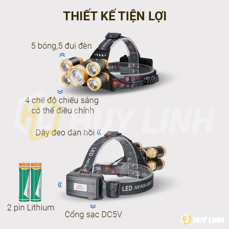 - Thời lượng pin: Đèn chính khoảng 3,5-4 giờ và đèn 5 sáng khoảng 2 giờ (thời lượng pin có thể kéo dài tùy theo dung lượng pin)