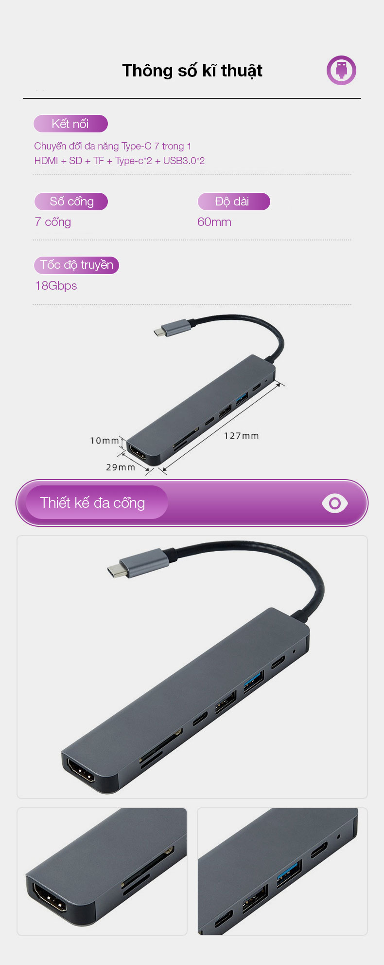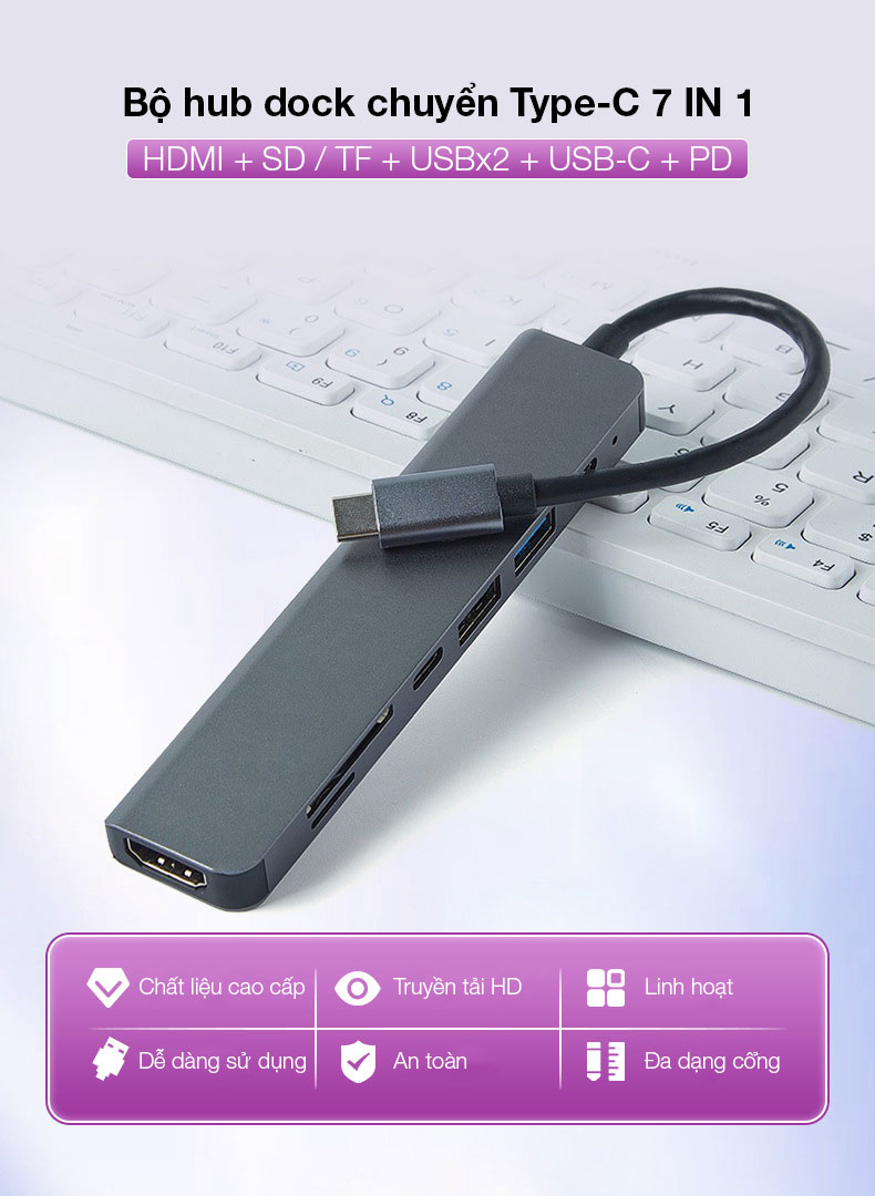 - Hub USB 7in1 cổng: USB-C to HDMI + SD / TF + USBx2 + USB-C + PD