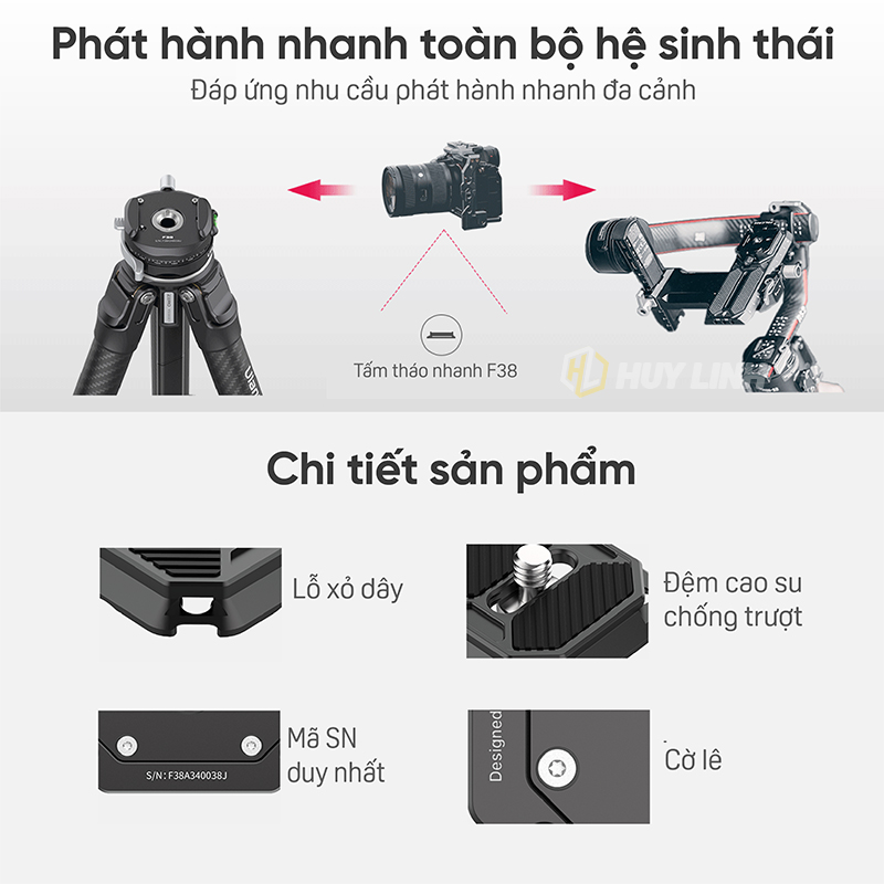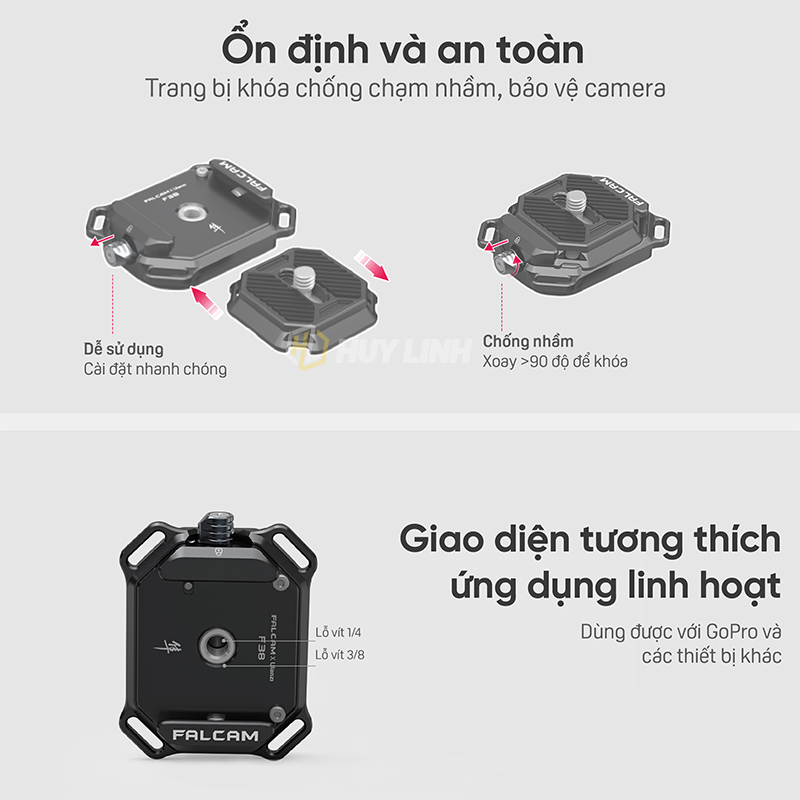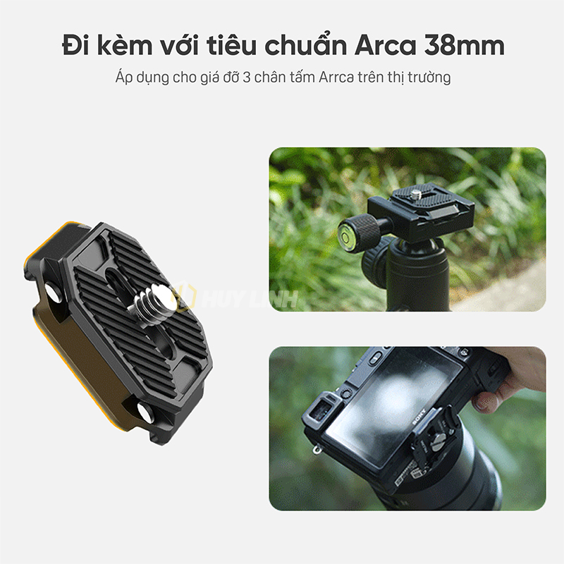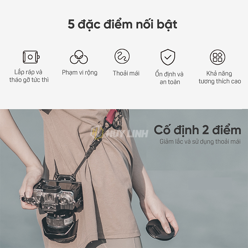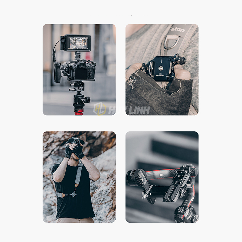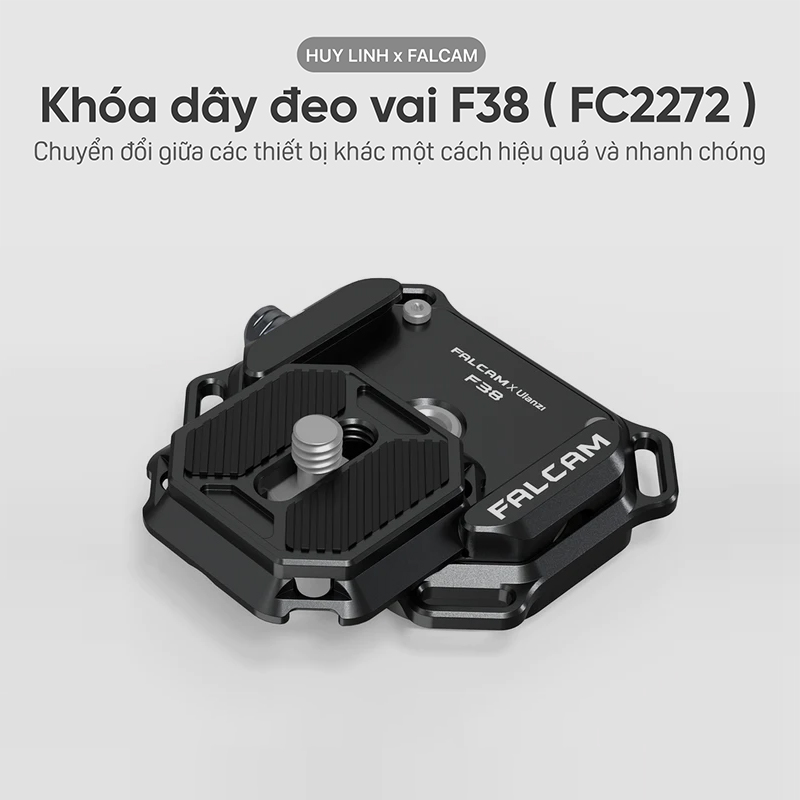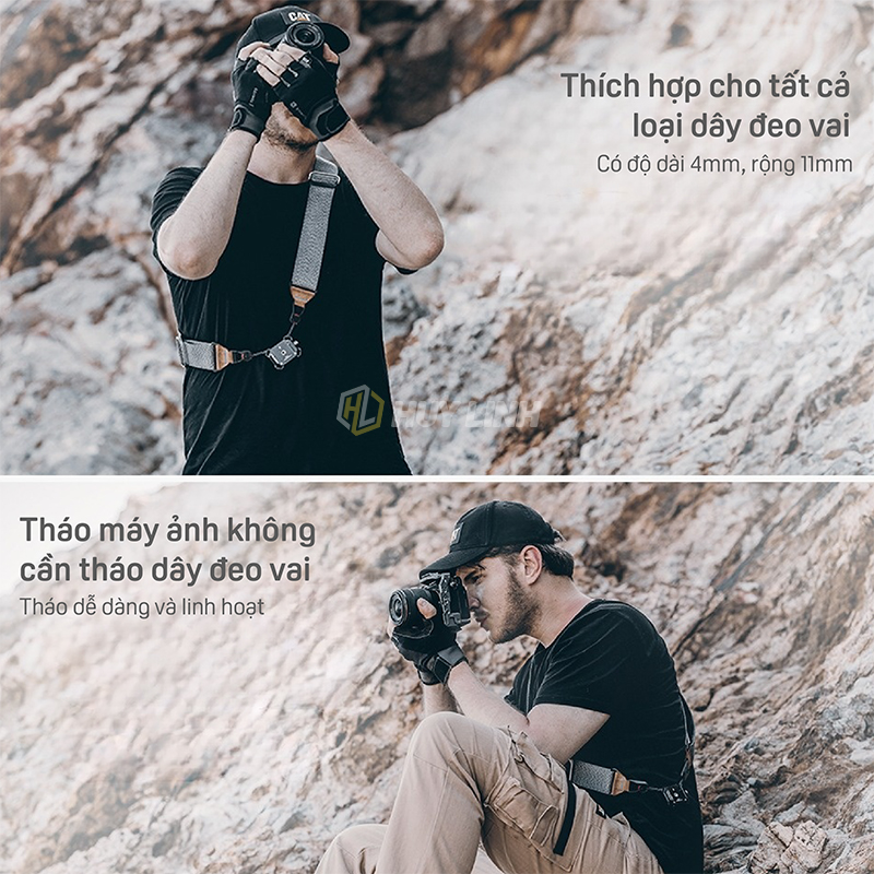 - Cho phép bạn gắn máy ảnh của mình vào hầu hết các dây đeo vai và tháo ra bằng cách nhấn nút. Bao gồm một khóa dây đeo vai và một tấm trên cùng với vít máy ảnh 1/4"-20, khóa có bốn rãnh để cố định dây đeo. Tấm trên cùng gắn vào khóa bằng cách nhả và tháo nhanh chỉ bằng một nút nhấn.