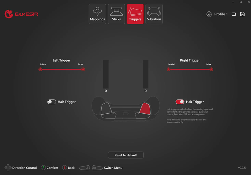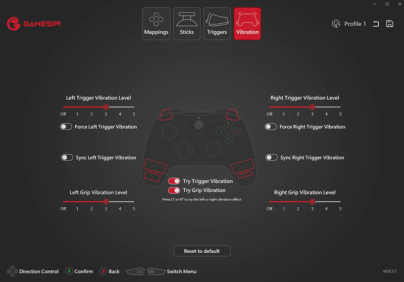 4/. Phần hiệu chỉnh rung Vibrations có thể config lại cường độ rung của 4 vị trí (2 trên Trigger và 2 Motor dưới) hoặc tắt nó đi.