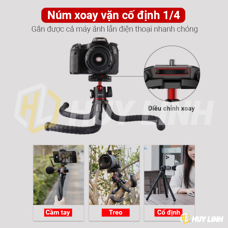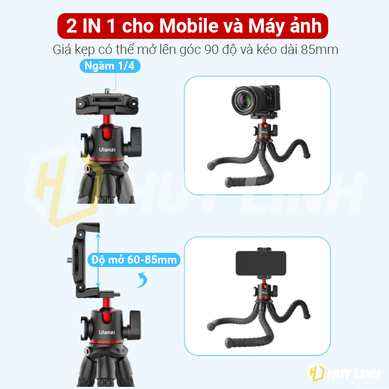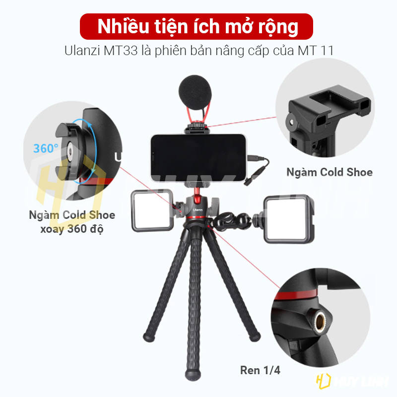 Ulanzi MT33 giá rẻ là mẫu flexible tripod hay còn gọi tripod chân bạch tuộc với thiết kế lõi bằng hợp kim gang nên cho phép uốn cong dễ dàng. Điểm thú vị và độc đáo của Ulanzi MT-33 là tích hợp sẵn ngàm kẹp điện thoại và ngàm Hotshoe bên hông cho phép gắn nhiều phụ kiện rời như: Đèn trợ sáng, micro định hướng hoặc cài áo đều được. Mua Ulanzi MT33 là mẫu tripod upgrade mới nhất năm 2023 được nhiều Vloger chọn lựa như phụ kiện quay chụp thiết yếu.