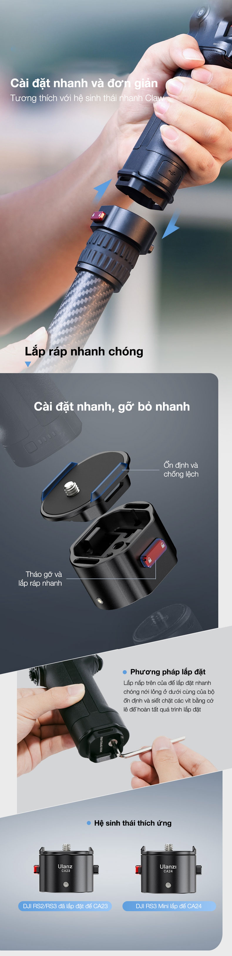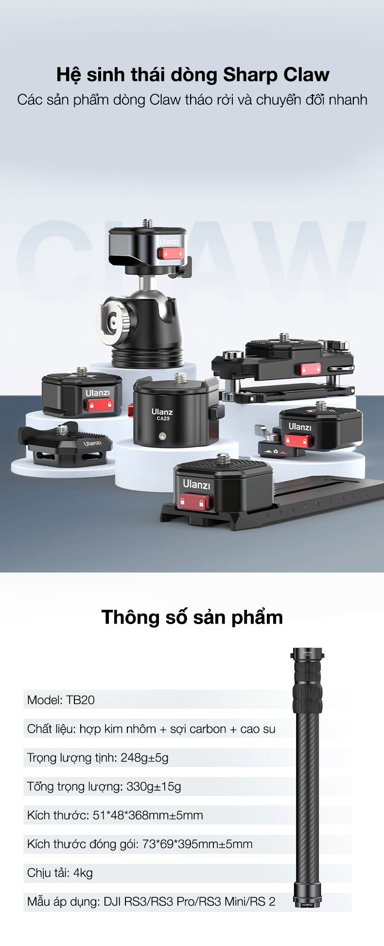 - Bộ ổn định CLAW Hệ sinh thái phát hành nhanh: Tháo gỡ và lắp ráp nhanh chóng, đơn giản và dễ sử dụng, các phụ kiện dòng Claw có thể dễ dàng mở rộng.