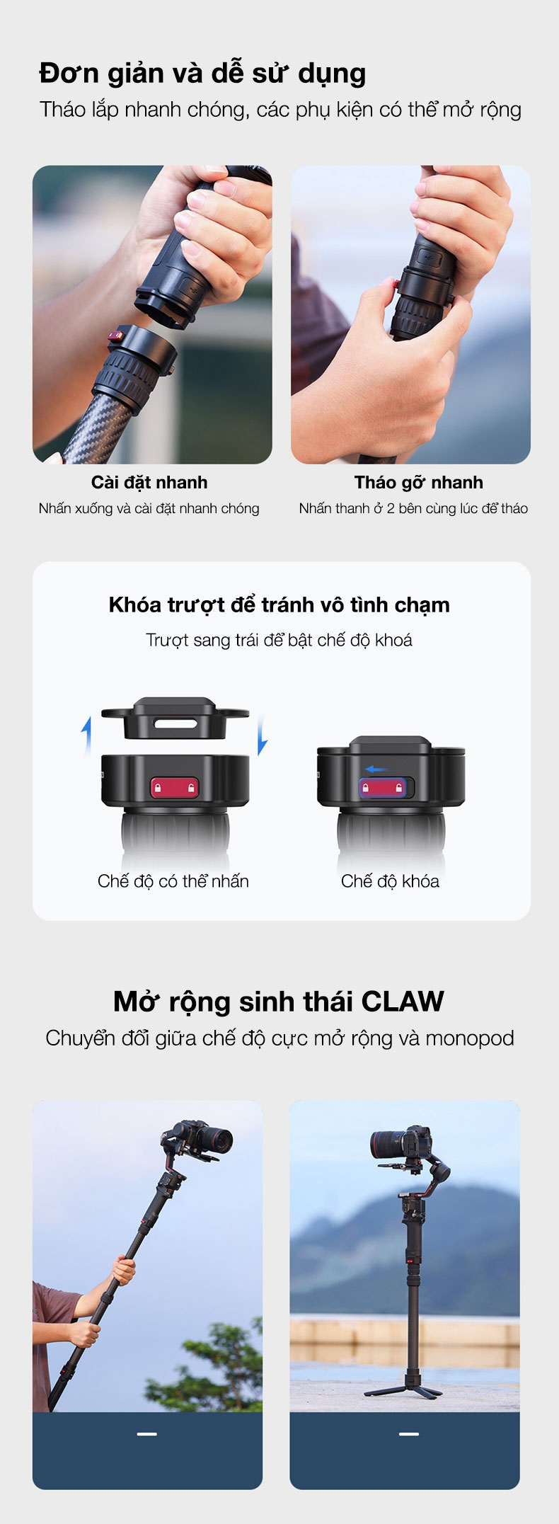 - Cách sử dụng mở rộng: Mở rộng sinh thái CLAW, dễ dàng chuyển đổi giữa chế độ cực mở rộng và chế độ chân máy đơn.