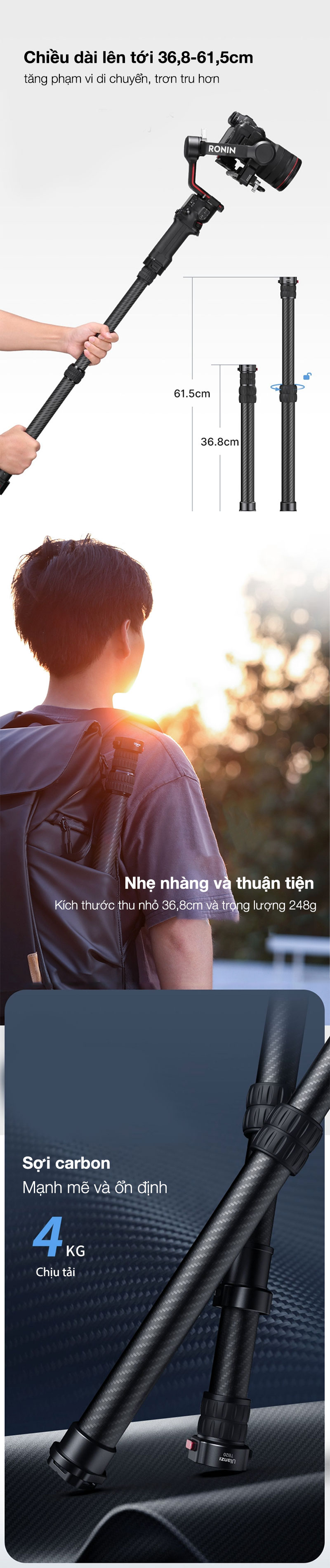 - Nhẹ và thuận tiện hơn khi mang theo: Kích thước lưu trữ là 36,8cm và trọng lượng khoảng 248g. Nó có thể dễ dàng bỏ vào ba lô và mang theo bên mình.