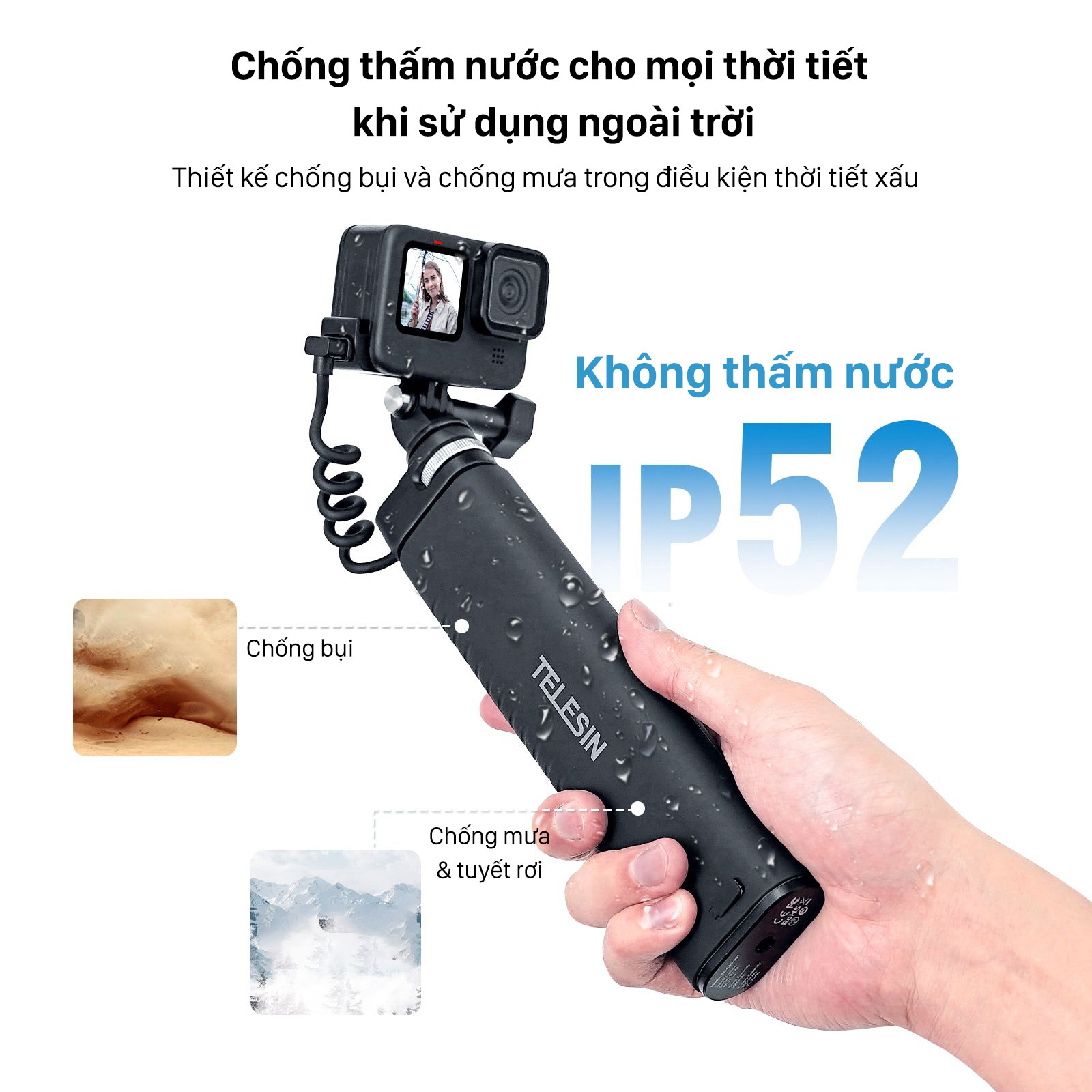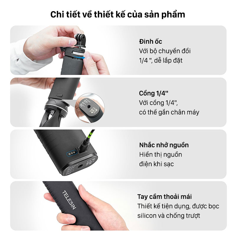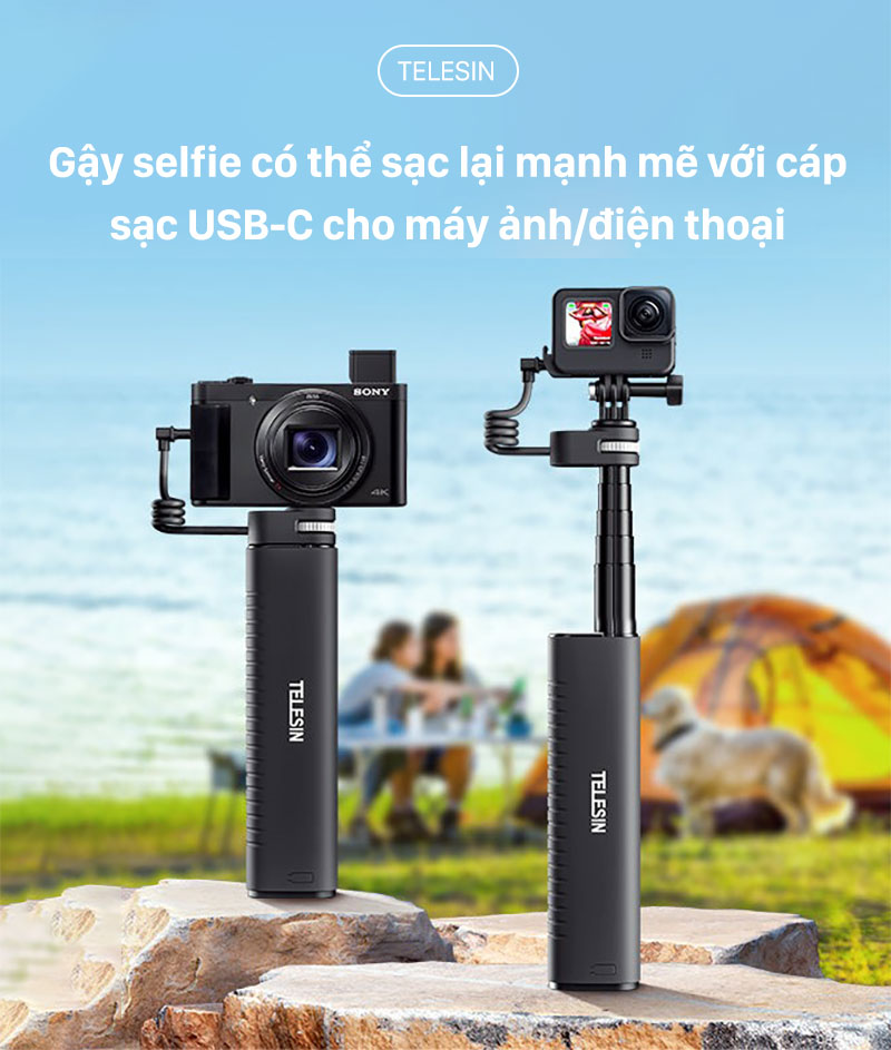 - Thiết kế 2 in 1 là gậy selfie kiêm sạc dự phòng, không ngại hết pin trong quá trình quay chụp hình.