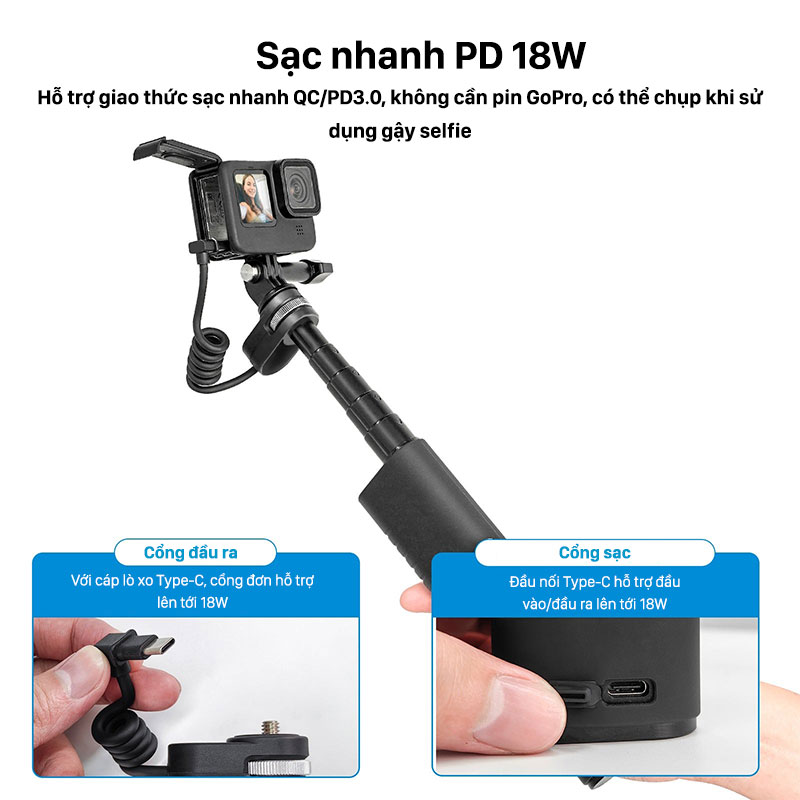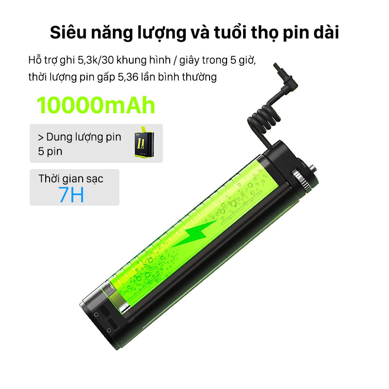 - Dung lượng pin lên tới 10000mAh, hỗ trợ sạc nhanh 18w có thể quay Gopro 5.3k/30fps trong 5 giờ.