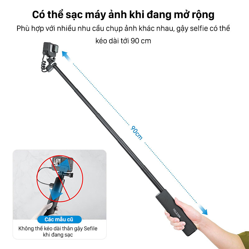 - Chiều dài tùy chỉnh từ 21 - 90cm, có thể sạc ngay khi kéo dài tối đa