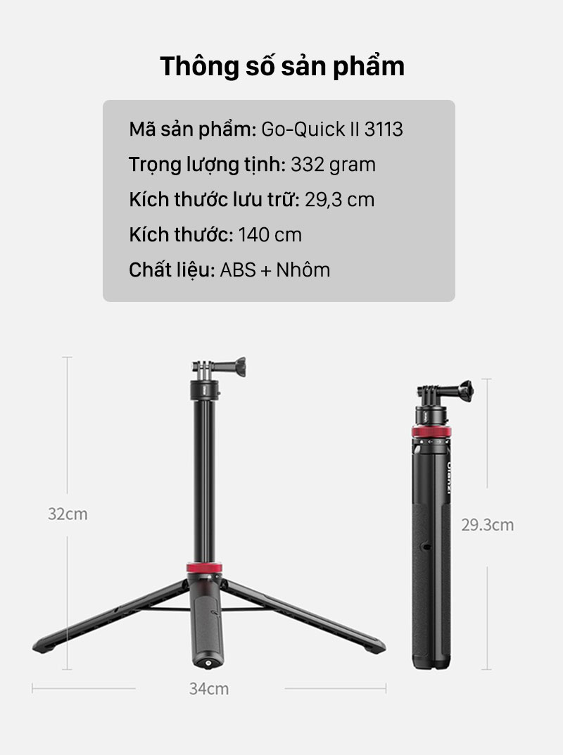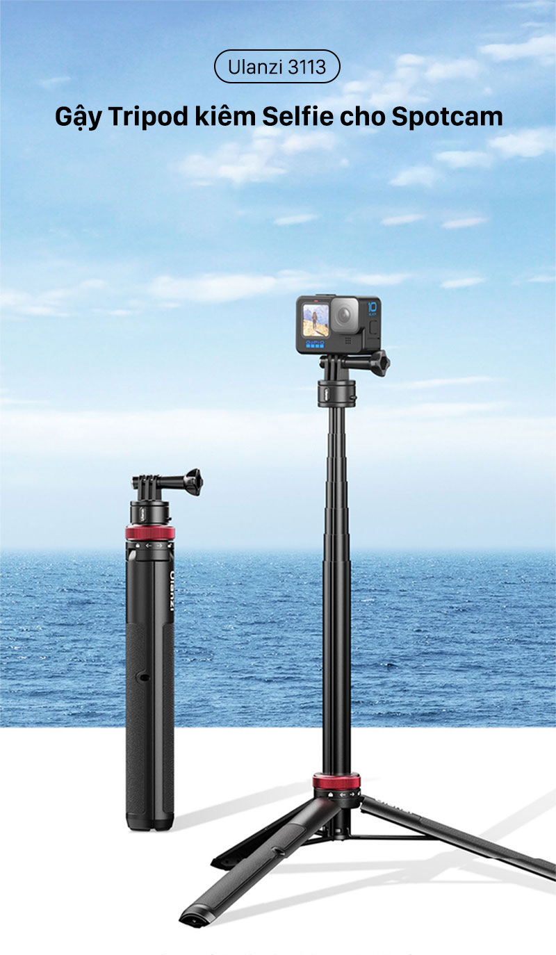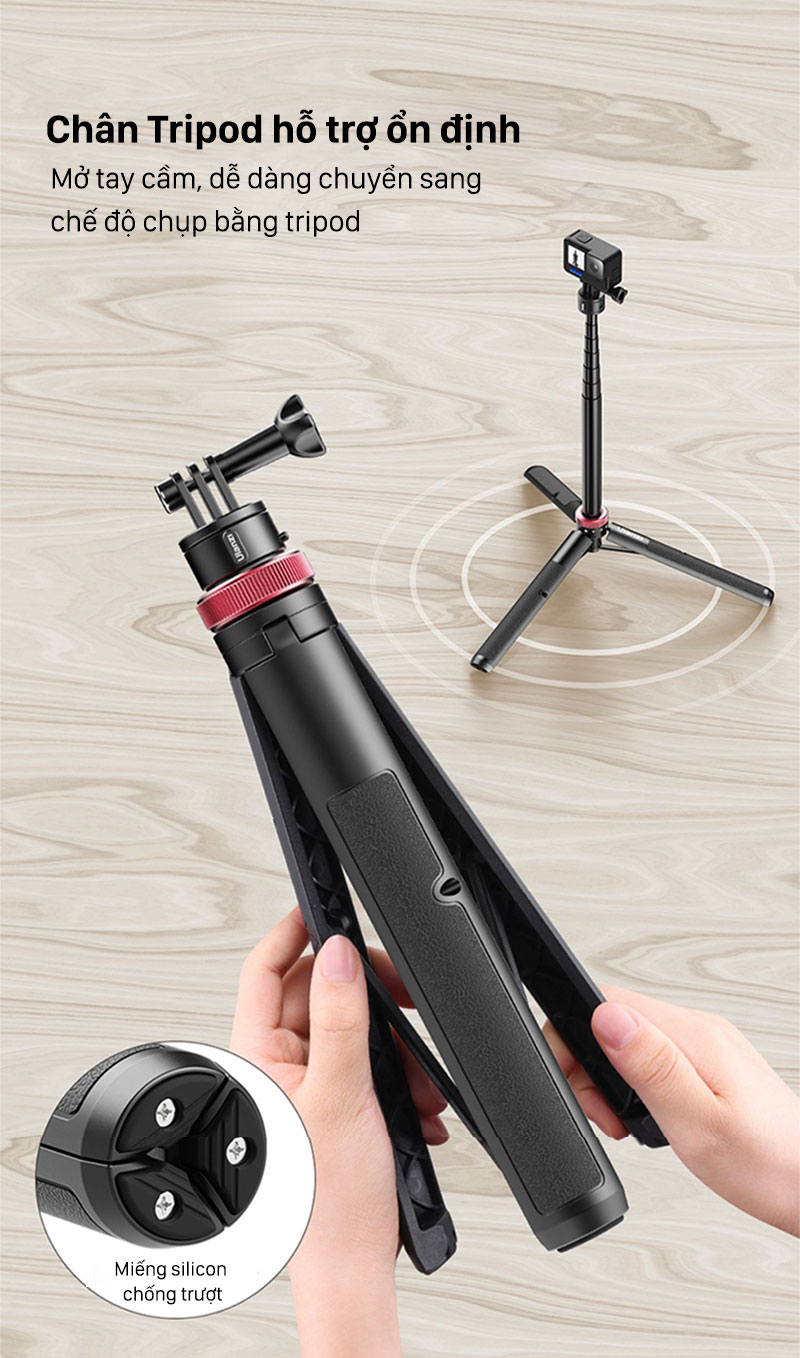 - Chân Tripod Hỗ Trợ Ổn Định- Mở tay cầm, dễ dàng chuyển sang chế độ chụp bằng tripod