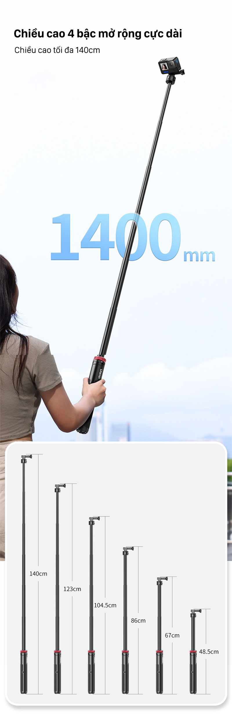 - Chiều cao 4 bậc Kéo dài thêm- Chiều cao tối đa 140cm/55in