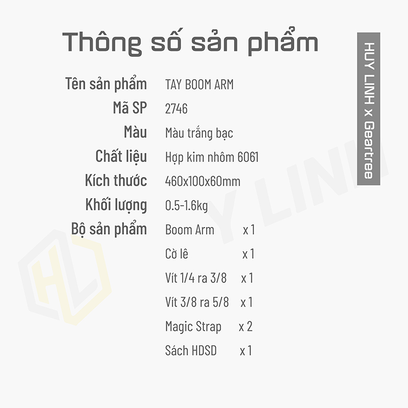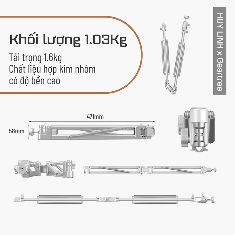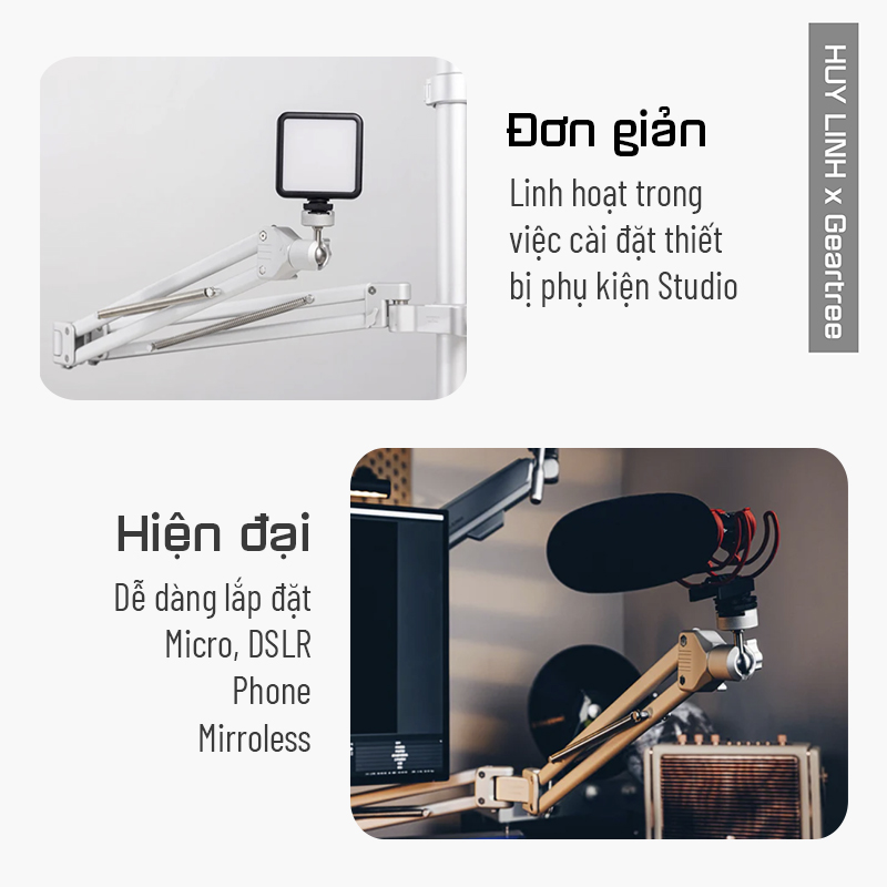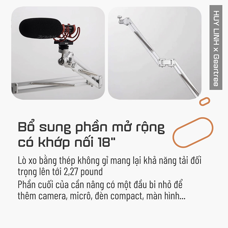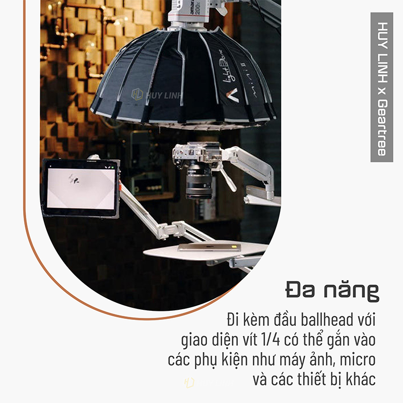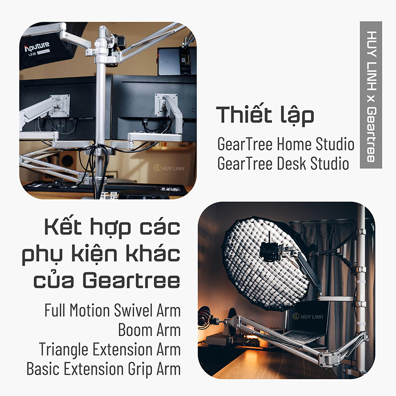 - Kết hợp với các phụ kiện khác nhau của Geartree như Full Motion Swivel Arm, Boom Arm, Triangle Extension Arm, and Basic Extension Grip Arm cho phép bạn gắn các thiết bị bổ sung.