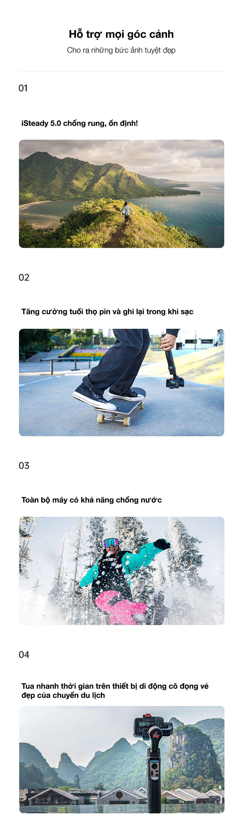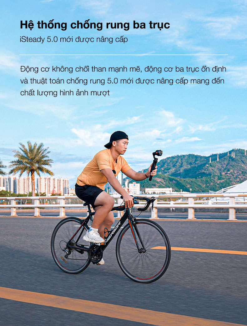 - Động cơ ba trục và thuật toán chống rung iSteady 5.0 được nâng cấp mới, mang đến sự mượt mà ngay cả trong các chuyển động liên tục.
