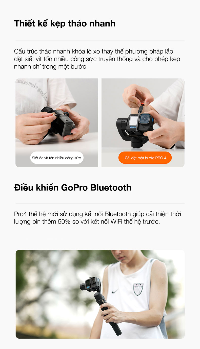 - Thiết kế hoàn toàn mới trong việc lắp đặt Gopro, kẹp tháo nhanh với khóa lò xo thay vì khó khăn với vít siết chặt.