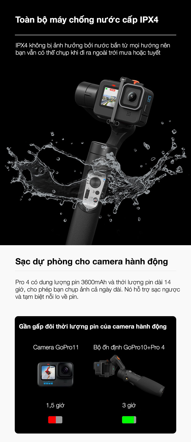 - Thiết kế chống nước IPX4 giúp bạn sử dụng iSteady Pro 4 ngay cả trong điều kiện môi trường ẩm ướt.