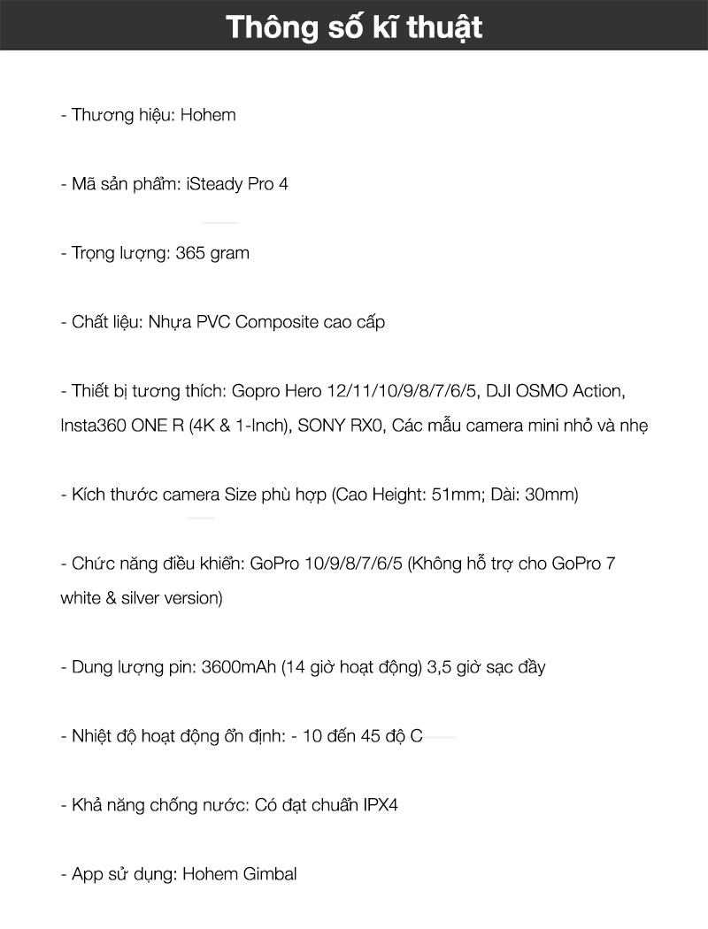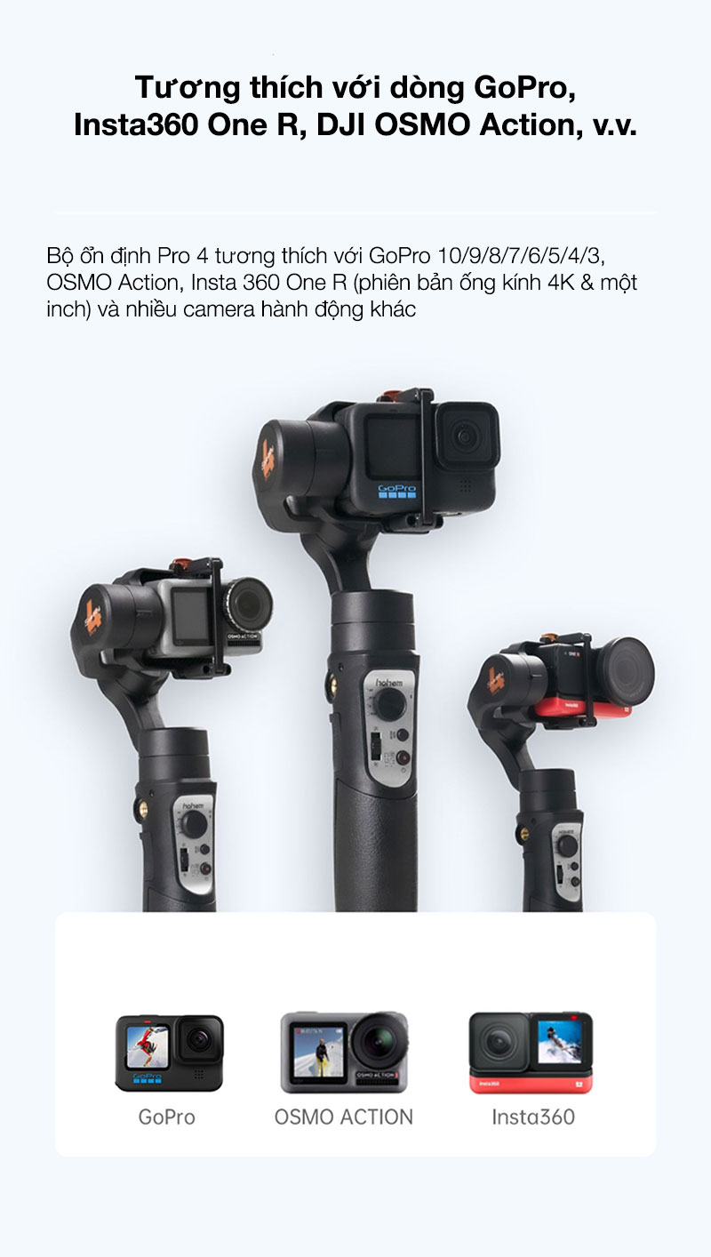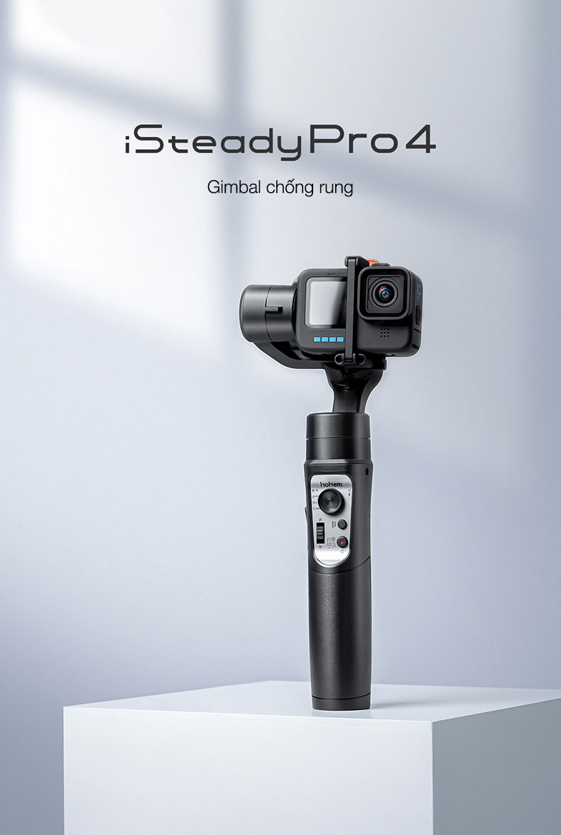 - iSteady Pro 4 tương thích với GoPro Hero 11/10/9/8/7/6/5/4/3, DJI OSMO Action, Insta360 ONE R (4K & 1-Inch) và các camera hành động khác có kích thước tương tự, kích thước tối đa: H(51mm) x W(30mm).