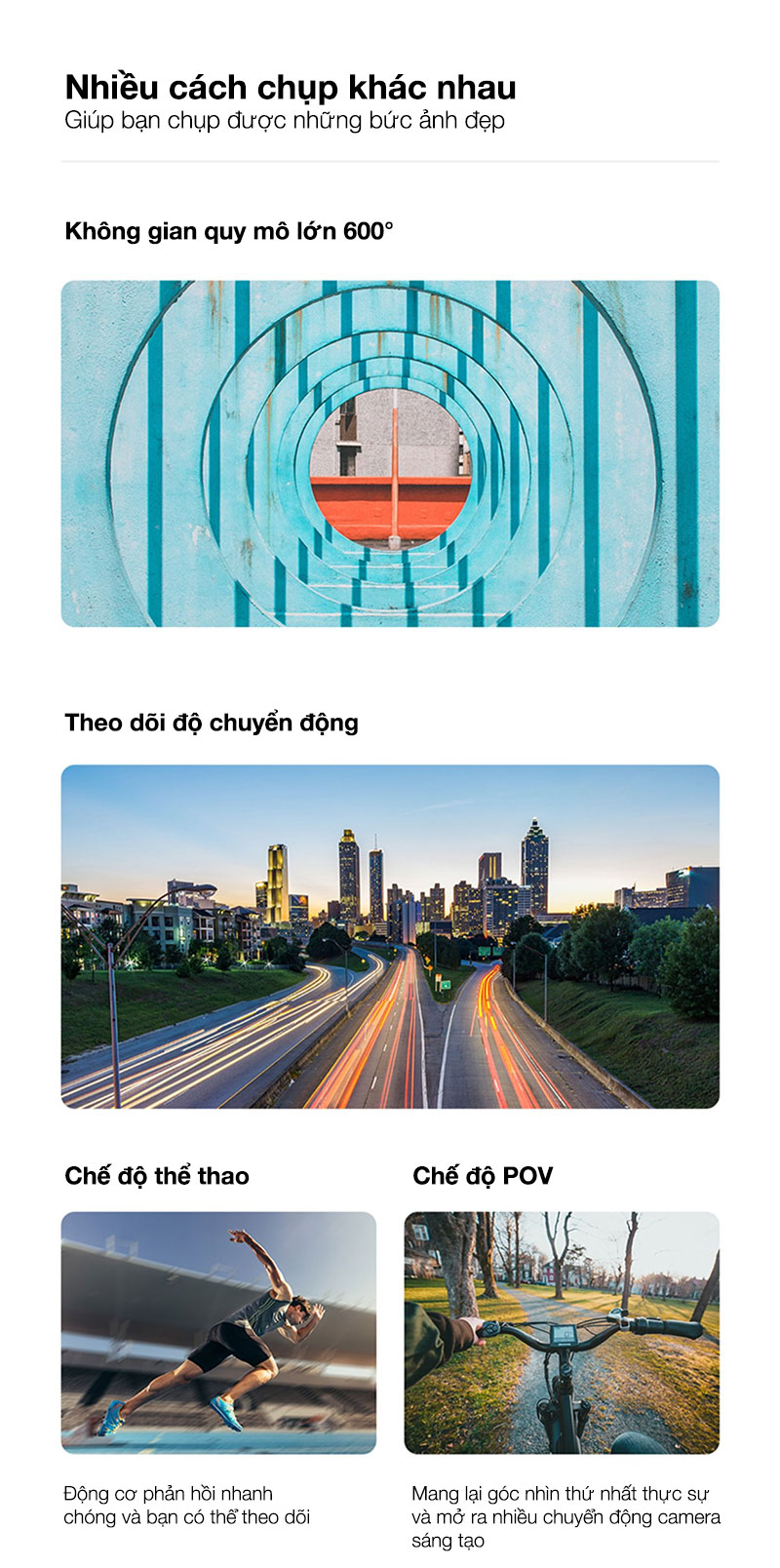 - 07 chế độ làm việc được tích hợp sẵn cho bạn thỏa sức sáng tạo: Person Point of View, Pan & Tilt Follow, Pan Follow, Lock, 600° Rotational Inception Mode, Sport Mode, Motion Timelapse.