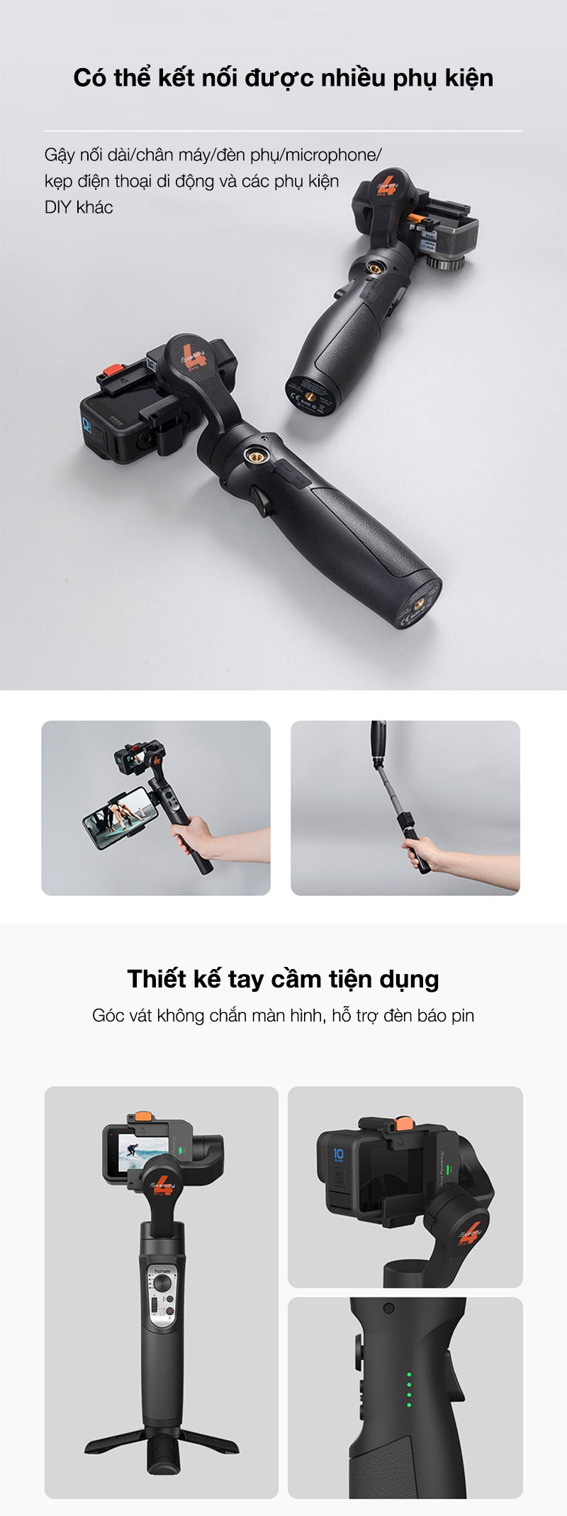 - Hai lỗ vít mở rộng 1/4 ở phần giữa và dưới cùng của tay cầm gimbal, cho phép bạn thêm vào thanh mở rộng, giá ba chân, đèn LED, micrô, giá đỡ điện thoại....