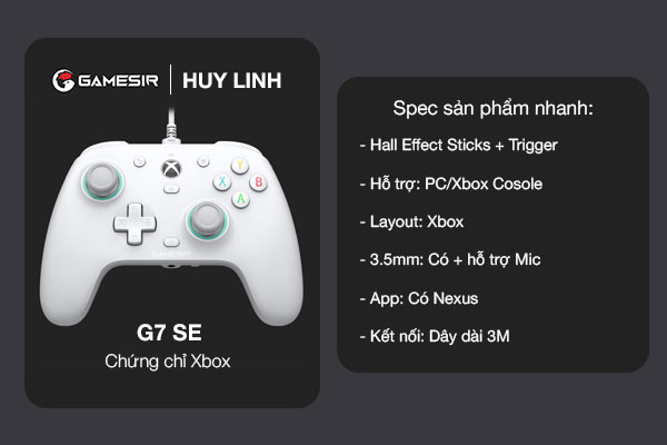 Gamesir G7 SE là chiếc tay cầm đầu tiên mà Gamesir ứng dụng Hall Effect vào phần Stick + Trigger. Phiên bản này có màu trắng được thiết kế riêng và có chứng chỉ của Xbox do đó bạn có thể chơi trên các hệ máy Console Xbox có thể kể đến như: Xbox One, X, S + Windows 10,11