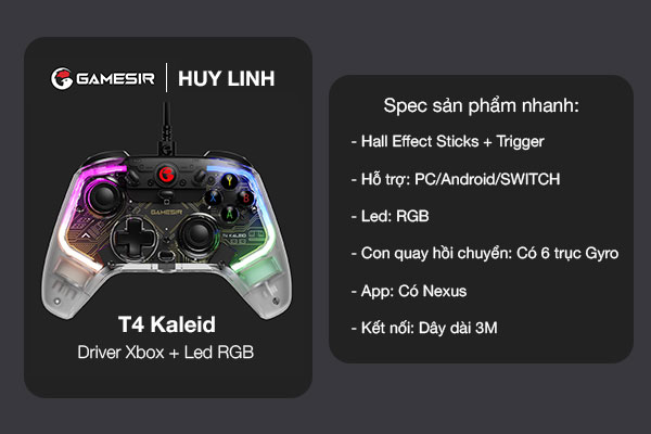 Phiên bản ra mắt gần như cùng thời điểm với G7 SE đó là Gamesir T4 Kaleid, chiếc tay cầm này cũng trang bị Hall Effect ở Trigger + Stick, nó ko có chứng chỉ của Xbox nhưng vẫn sử dụng chung driver, ngoài ra nó khá điệu với led RGB đa sắc. Hỗ trợ các nền tảng thông dụng như: PC / Android và cả Switch nữa.