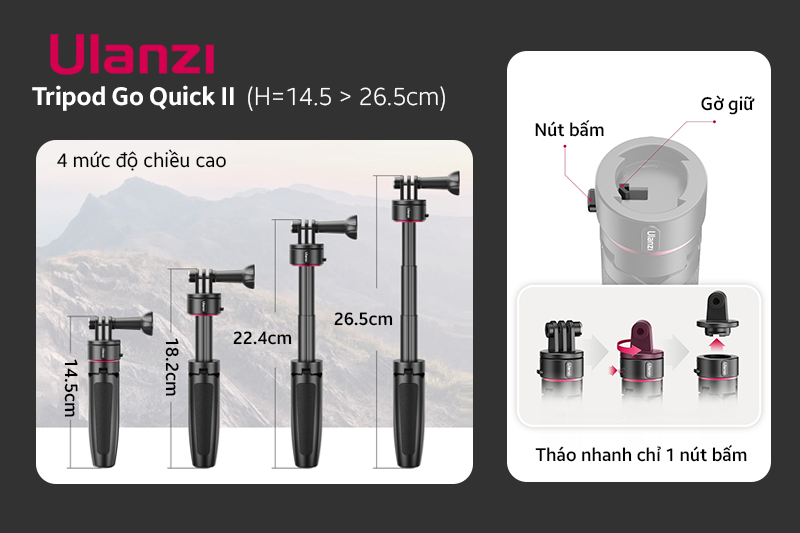 Bạn cần mẫu nhỏ gọn thì Tripod Spotcam Ulanzi Go II là sự lựa chọn tuyệt vời tuy nhiên chiều của nó sẽ có sự hạn chế chỉ giới hạn ở 26.5cm và 4 mức độ Level mở chiều cao. Còn đối với dòng Tripod Gopro Ulanzi Go Quick II 1.4m thì sẽ có tới 6 mức độ mở chiều cao. Điểm chung của 2 dòng tripod là là tháo lắp đầu chuyển tiếp Mount bằng 1 nút bấm cực nhanh.