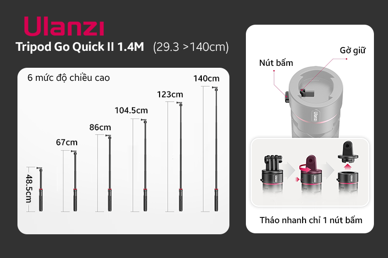 Tripod cho camera hành động Ulanzi Go Quick II 1.4m gấp gọn 29.3cm kéo dài tối đa được 140cm
