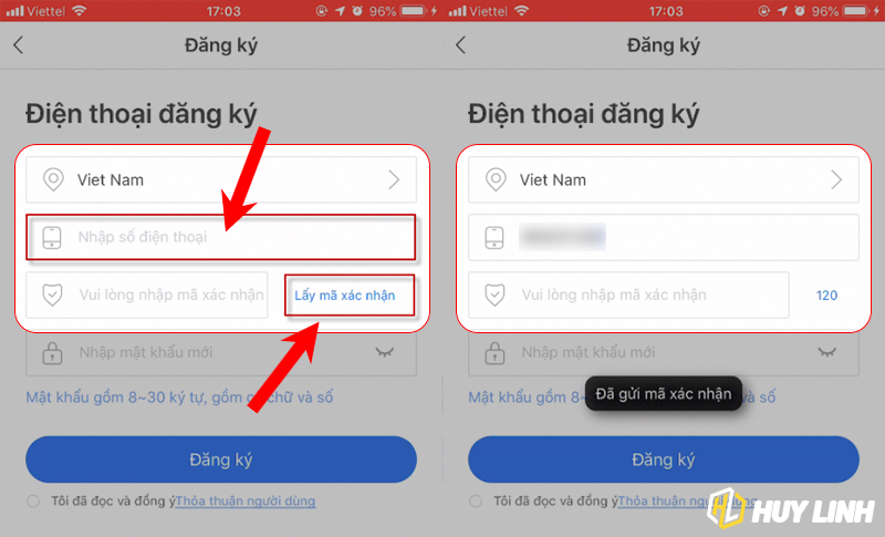 - Nhập SĐT sau đó nhấn vào nút Lấy mã xác nhận như trong hình minh họa bên dưới (*Lưu ý: SĐT đăng ký phải bỏ số 0 ở đầu, ví dụ như điện của các bạn là 0989123123 thì sẽ nhập vào là 989123123)