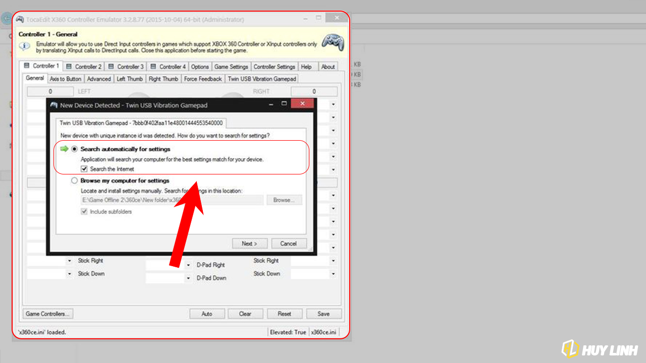 - Tiếp tục chọn Search Automatically for settings chọn tiếp Next để phần mềm dò các nút trên chiếc gamepad của các bạn và tự động Config cho phù hợp > chờ trong giây lát phần mềm quét xong và chọn Finish để kết thúc.