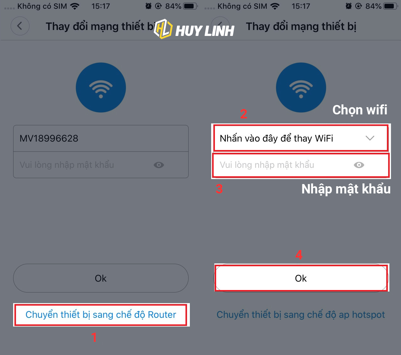 Chọn Chuyển thiết bị sang chế độ router tìm wifi nhà bạn sau đó điền mật khẩu wifi và chọn Ok