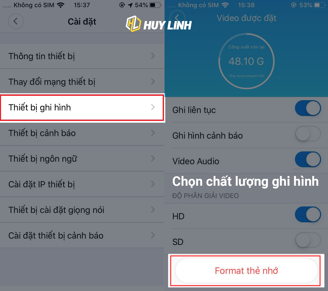 Cài đặt chế độ ghi hình và lưu trữ video trực tiếp vào thẻ nhớ lắp vào camera xài app V380 Pro
