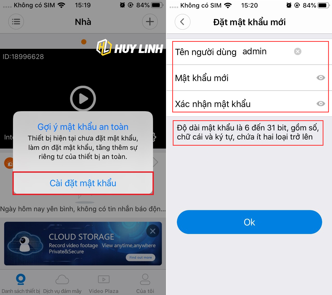 Chọn Cài đặt mật khẩu sau đó điền mật khẩu vào 2 dòng trên màn hình. Lưu ý 2 dòng điền giống nhau và ít nhất 6 kí tự gồm cả chữ cái và số sau đó chọn Ok.