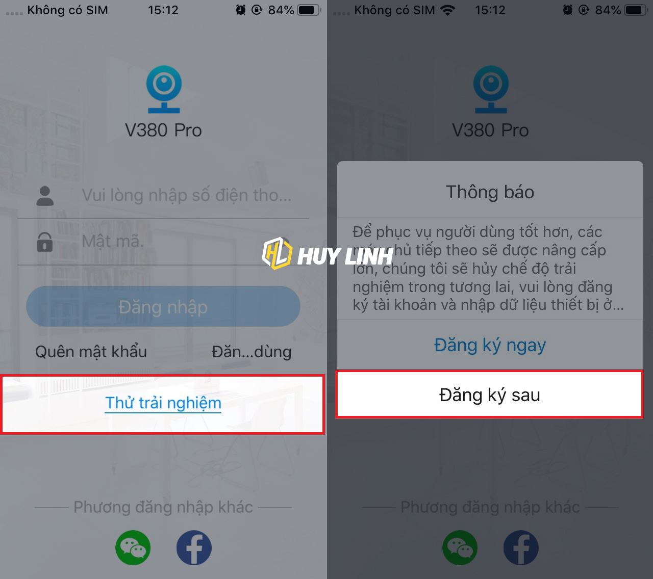Sau khi kết nối điện thoại với wifi của camera ta mở phần mềm V380 Pro và bắt đầu cài đặt cho camera kết nối với wifi. Khi mở phần mềm lên ta chọn Thử trải nghiệm và tiếp tục chọn Đăng kí sau