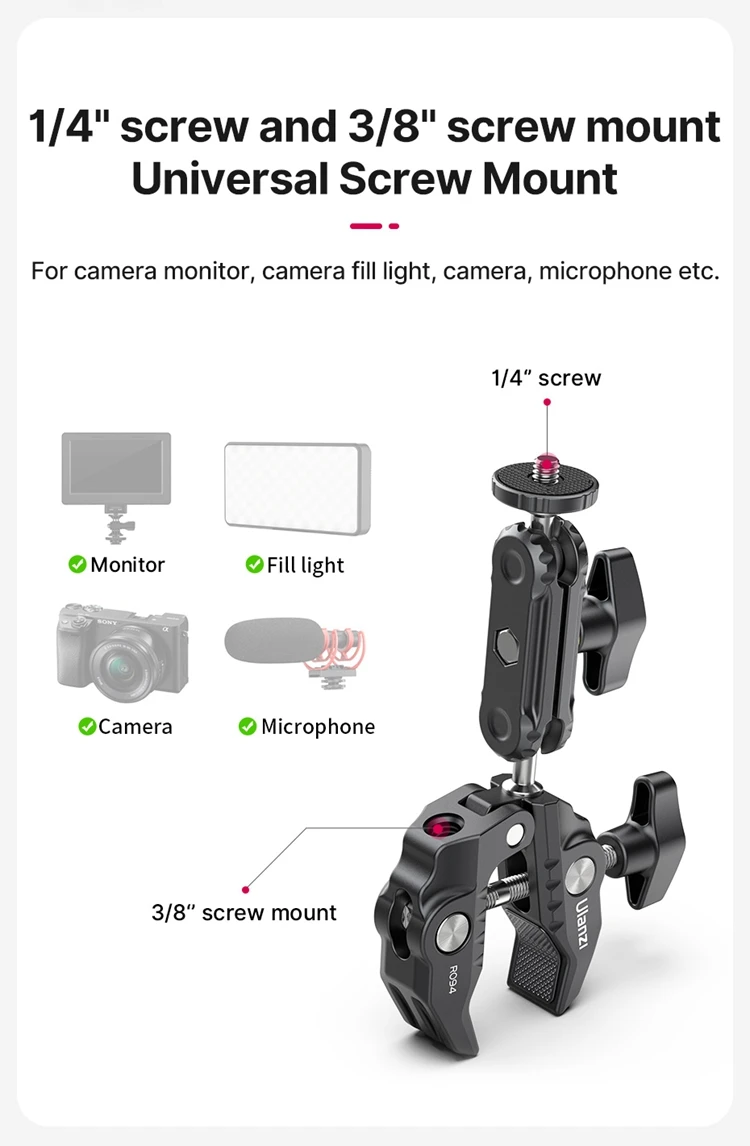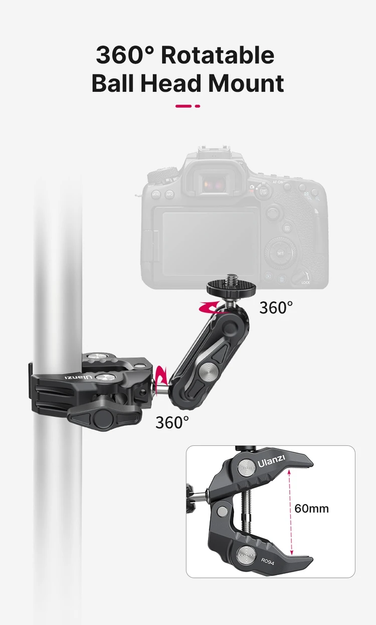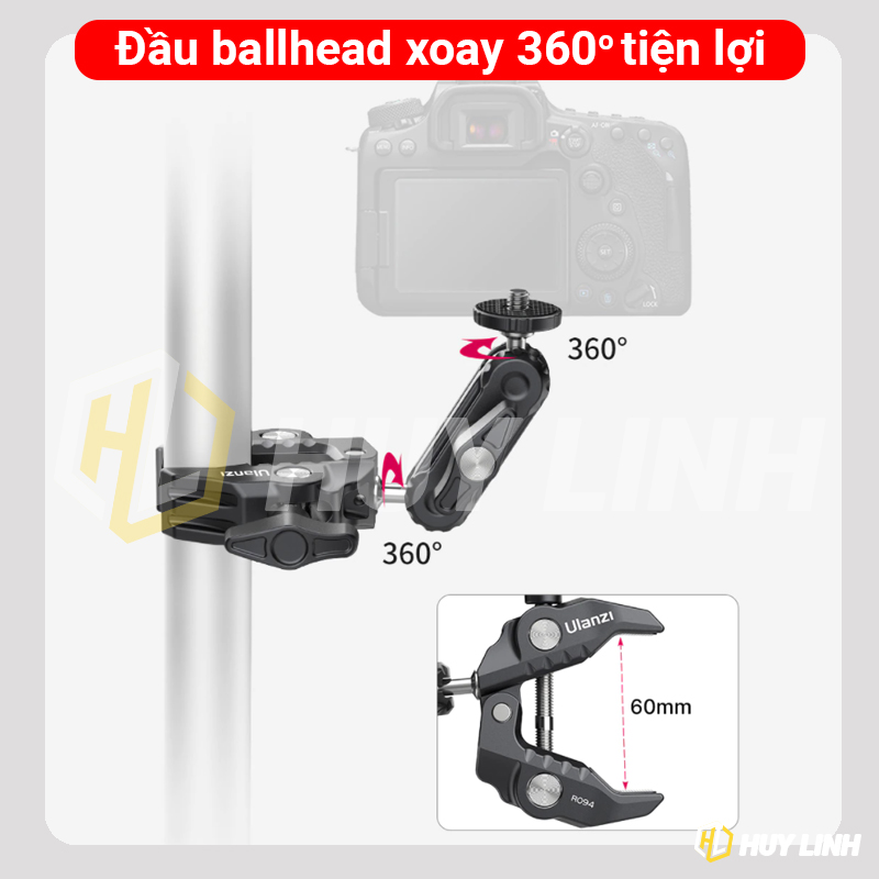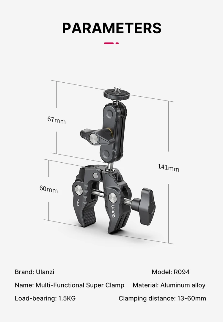 - Được làm bằng hợp kim nhôm siêu bền, chịu tải lên đến 1.5kg, và khoảng cách kẹp là 13-60mm.
