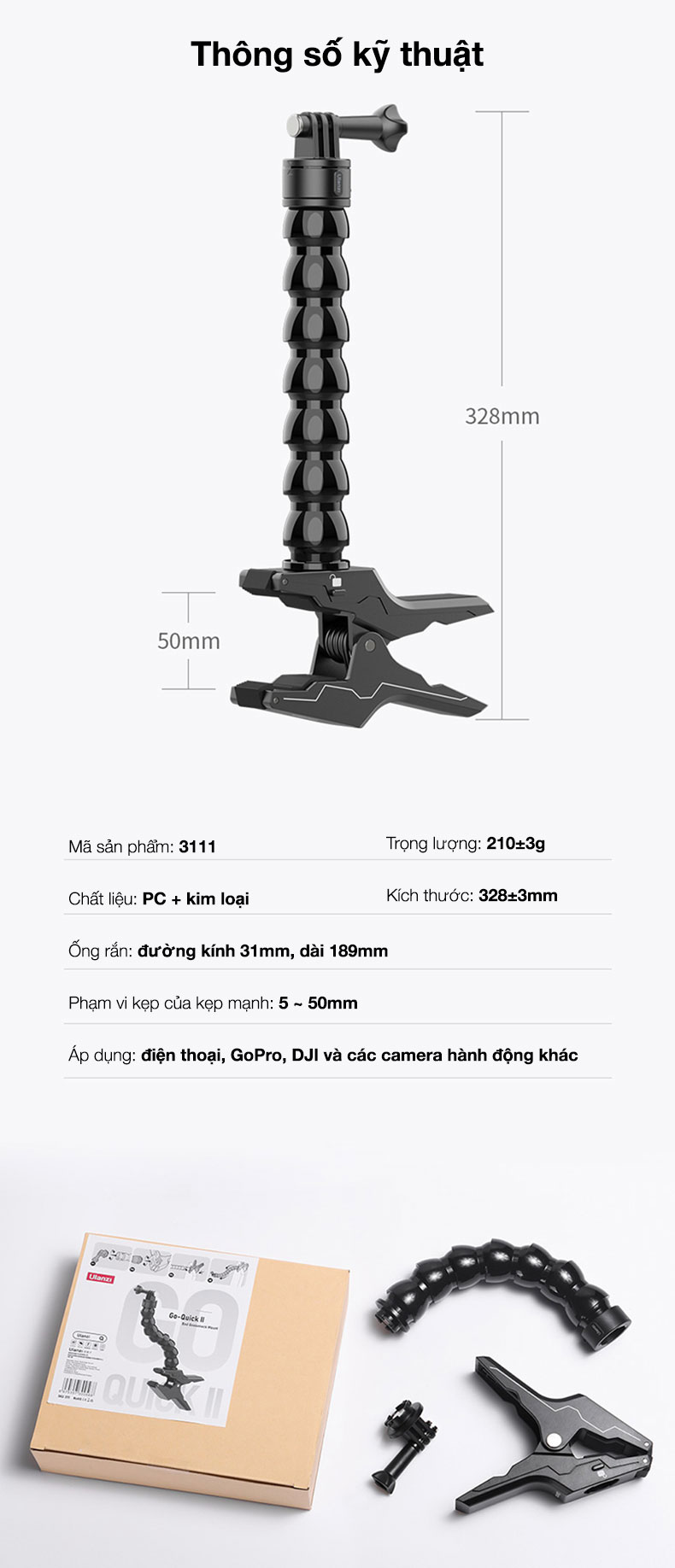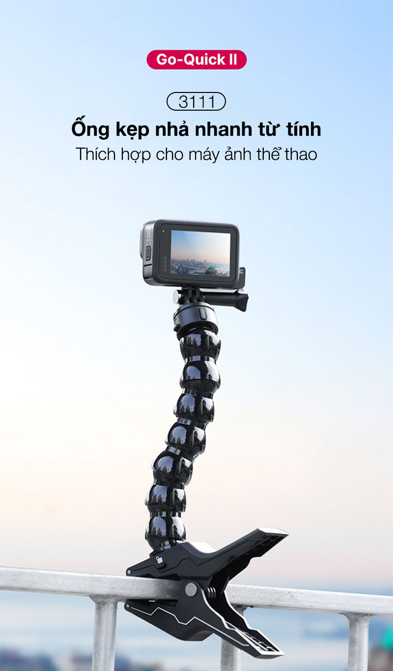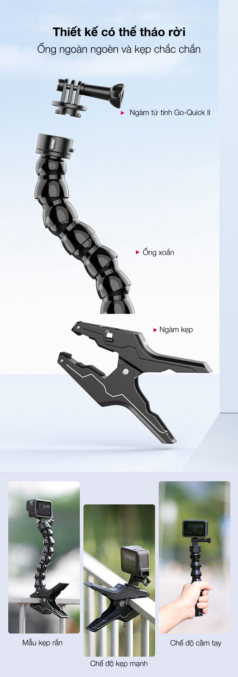 - Thiết kế có thể tháo rời: Kẹp và cổ ngỗng có thể tháo rời, cả hai đều được kết nối bằng Go Quick II Mount, có thể được sử dụng riêng.