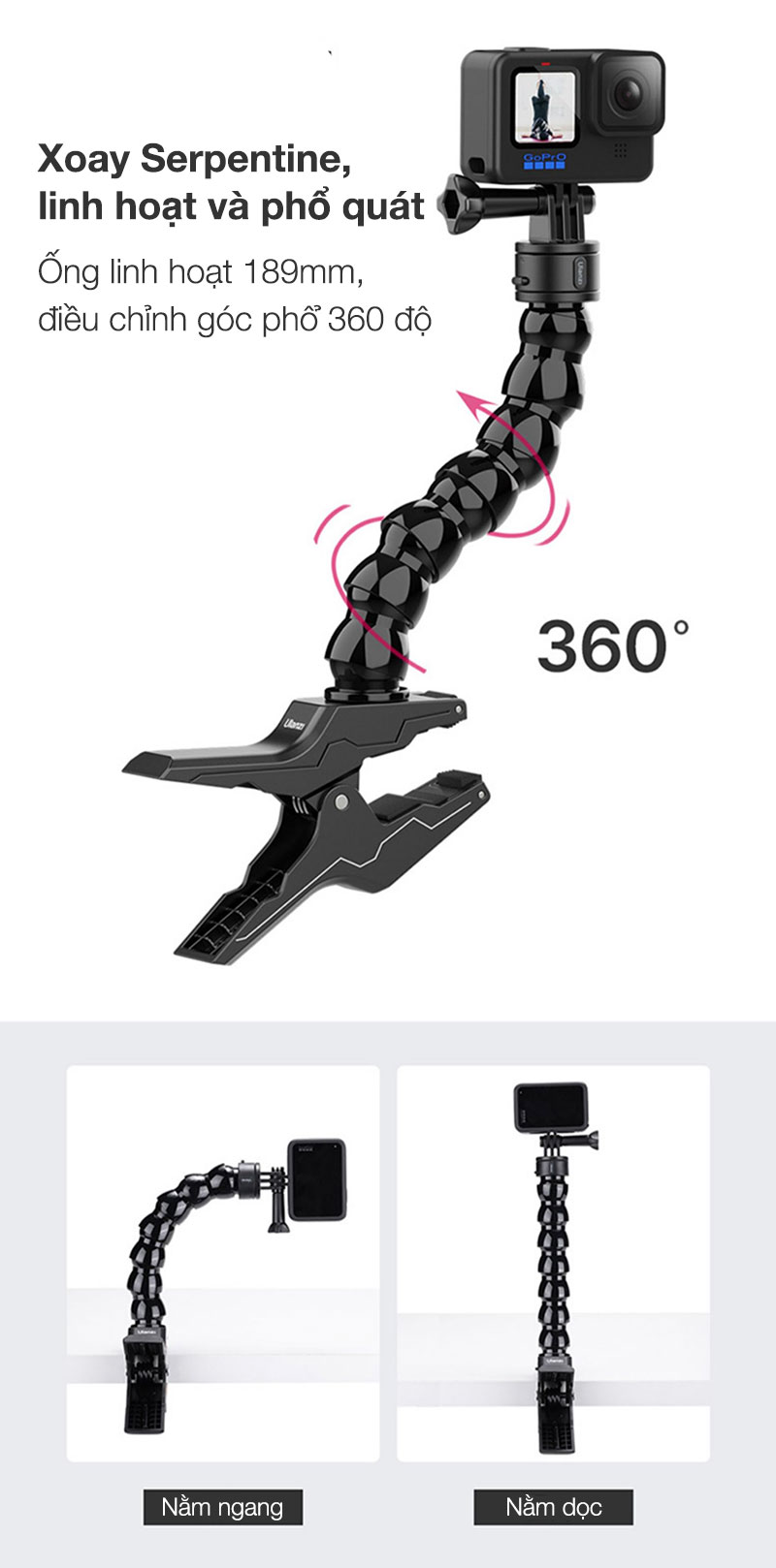 - Phần cổ ngỗng linh hoạt dài 19cm, điều chỉnh góc đa năng 360°, hỗ trợ chụp ngang và dọc, mang đến tầm nhìn lý tưởng cho bạn.