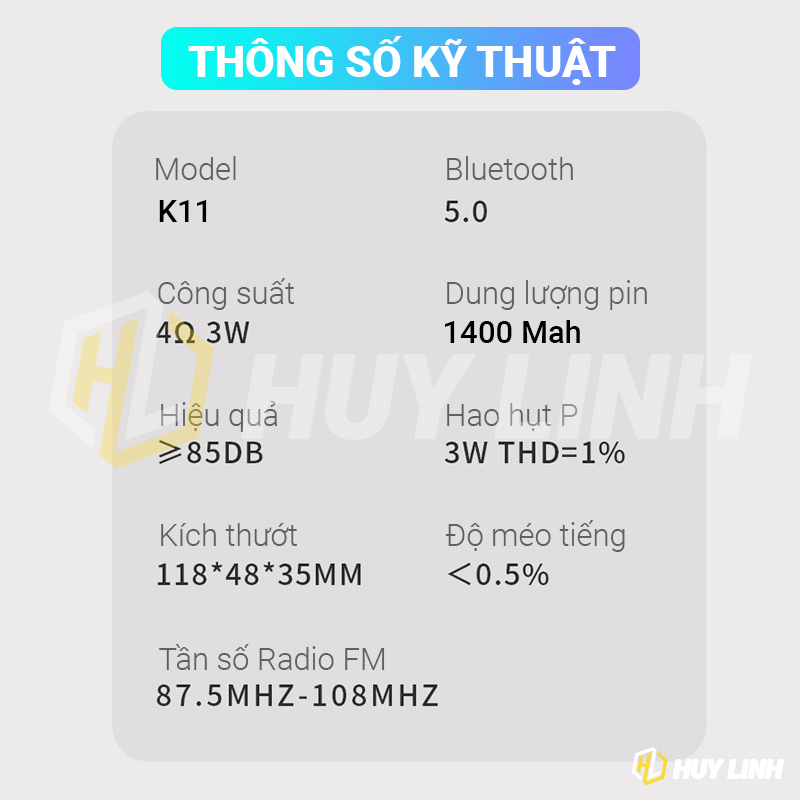 - Dung lượng pin lớn 1400mAh cho phép chơi nhạc 8 giờ liên tiếp (tùy âm lượng). Chơi nhạc từ TF card, AUX, nó có thể đáp ứng nhu cầu của bạn bất cứ khi nào, nghe đài FM, tự động tìm kiếm, sạc trong 3h và sử dụng được trong 5h, nếu sử dụng đồng hồ thời gian sử dụng lên tới 72h. Bạn hoàn toàn có thể thưởng thức âm nhạc một cách nhẹ nhàng.