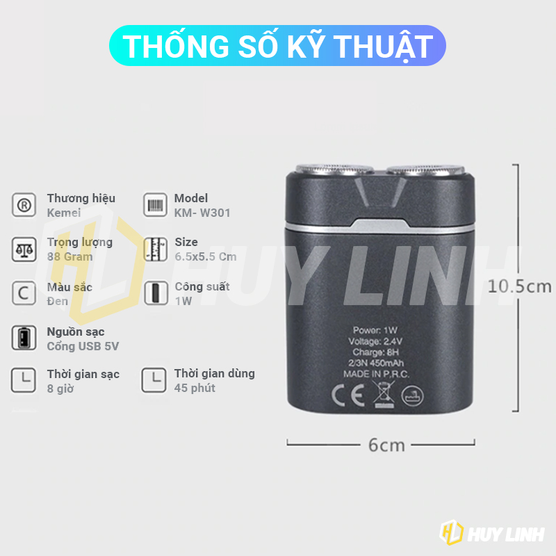 Thông số kỹ thuật máy cạo râu Mini Kemei W301