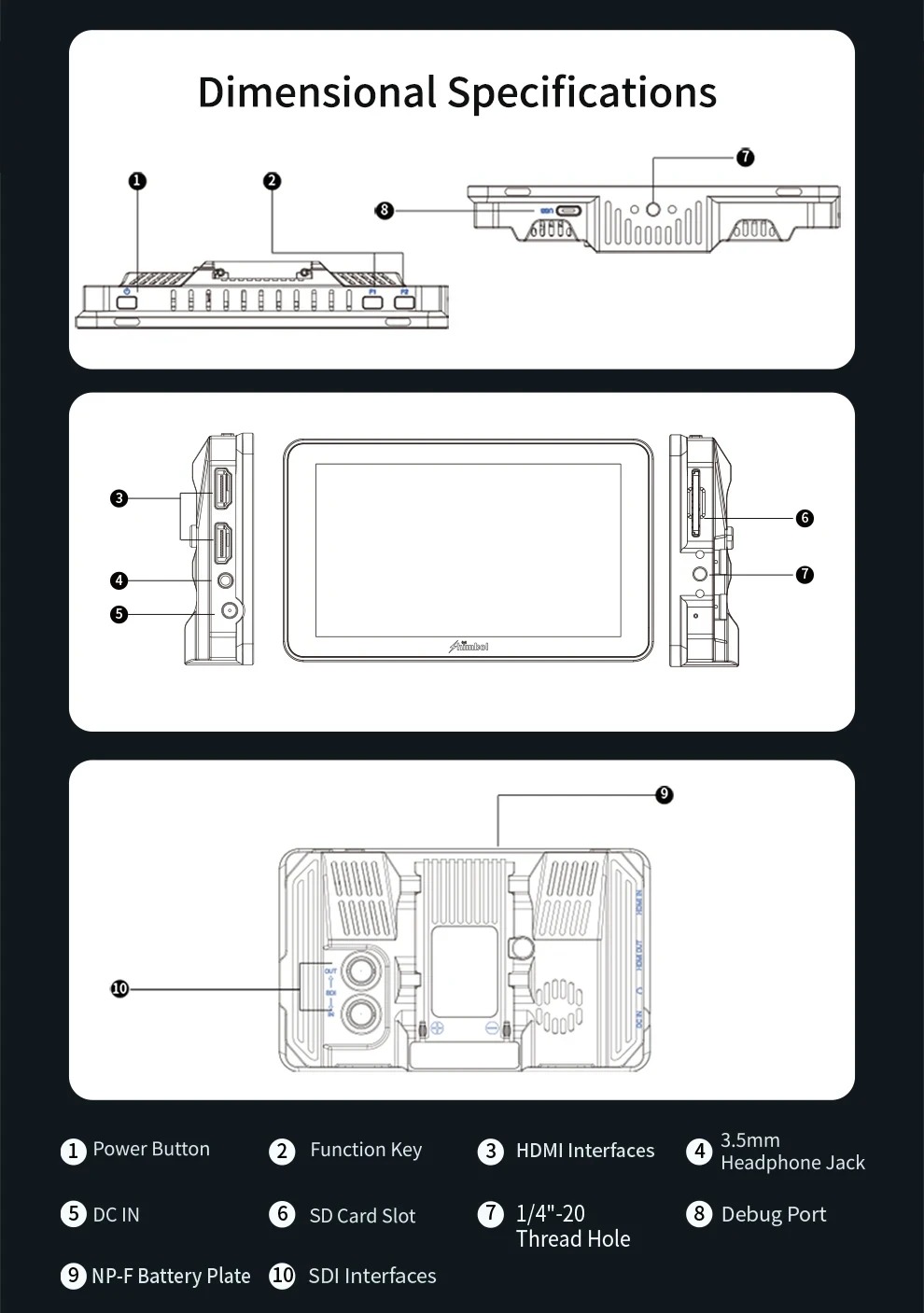 - Đầu vào: Đầu vào nguồn DC, Đầu vào HDMI, Đầu vào SDI, Khe cắm thẻ SD