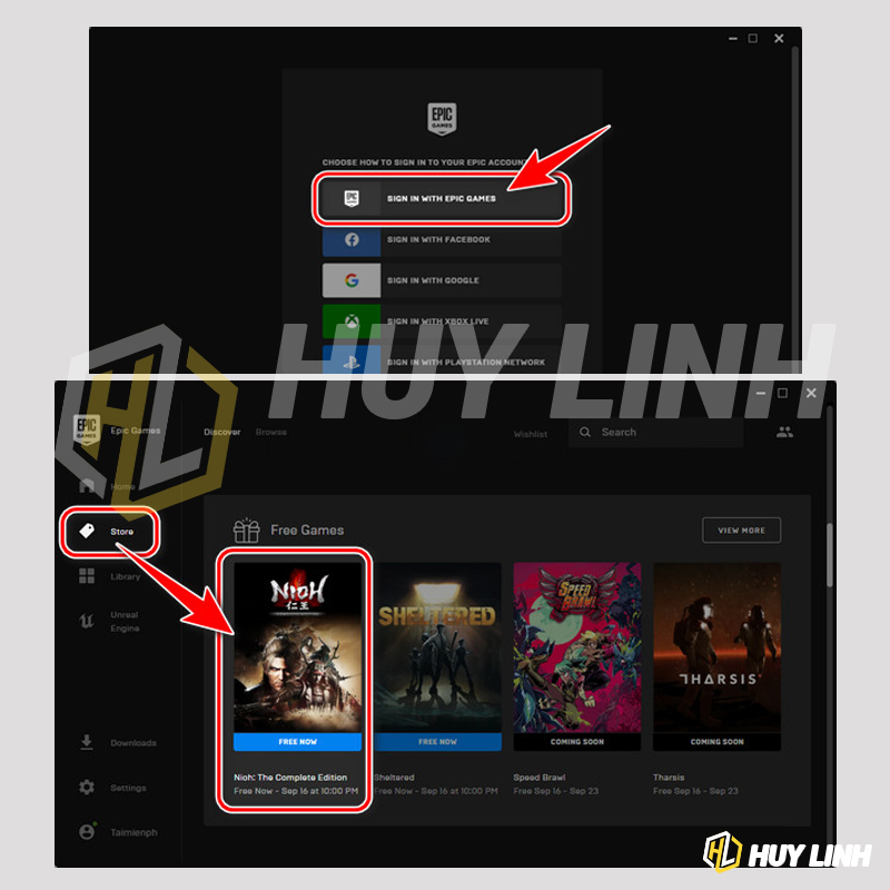 Bước 2: Đăng nhập vào Epic > Chọn Store, di chuyển xuống dưới tìm mục Free Games chọn Nioh The Complete Edition