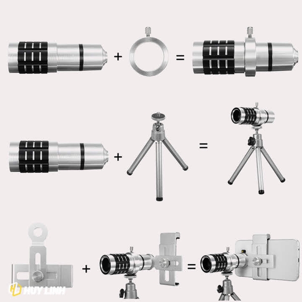 - Bộ lens kit bao gồm: ống kính, khung kẹp máy điện thoại (hoặc ốp lưng), tripod mini, túi đựng lens