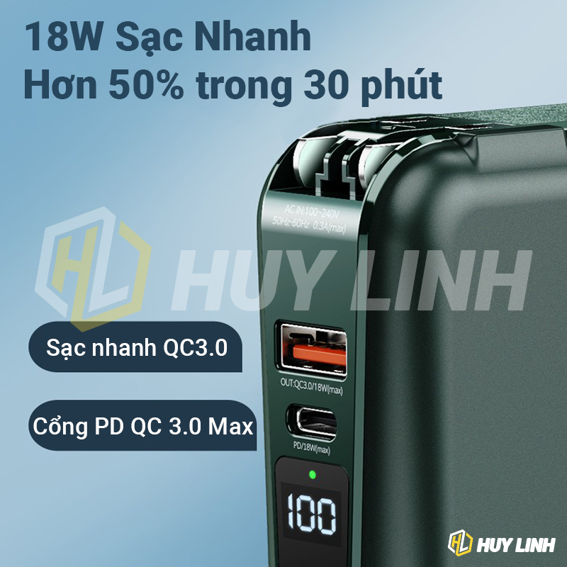 - Cổng ra : 1 cổng USB ( QC3.0 /18W) , 1 cổng TYpe-C (QC3.0/18W) , 1 dây sạc lightning, 1 dây sạc Type-C