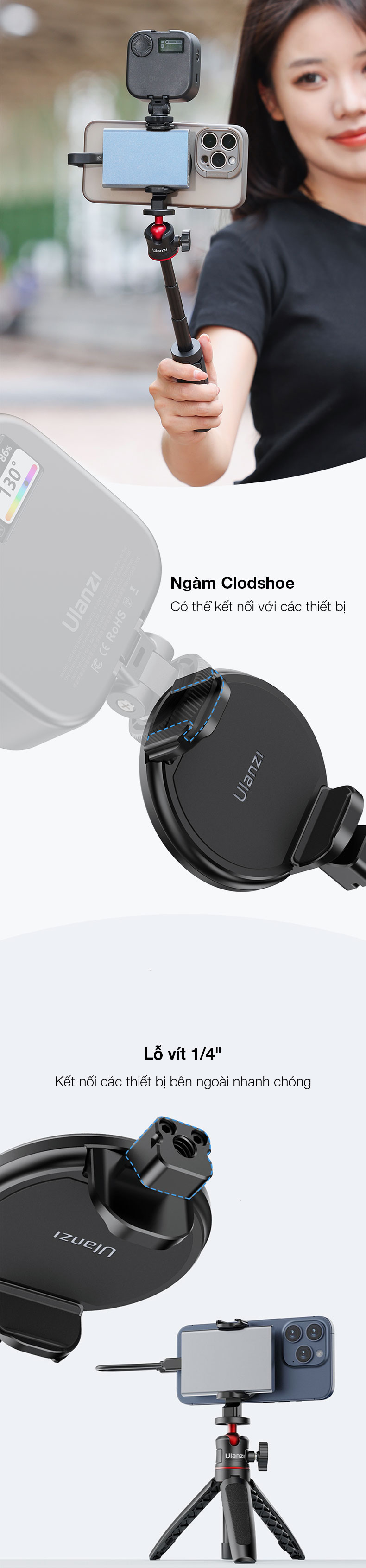 - Lỗ vít 1/4” và ngàm Coldshoe để mở rộng nhiều phụ kiện