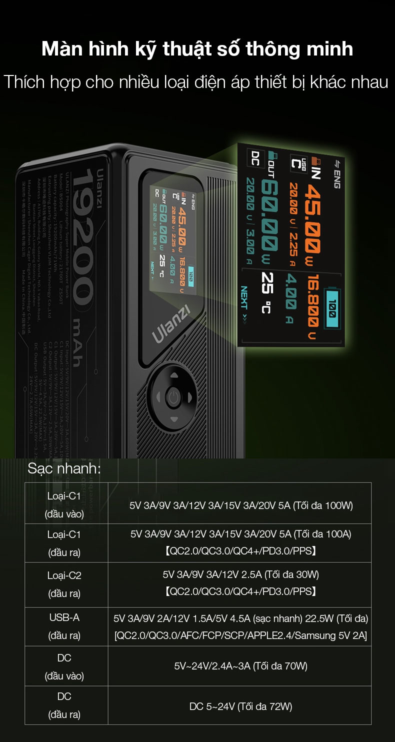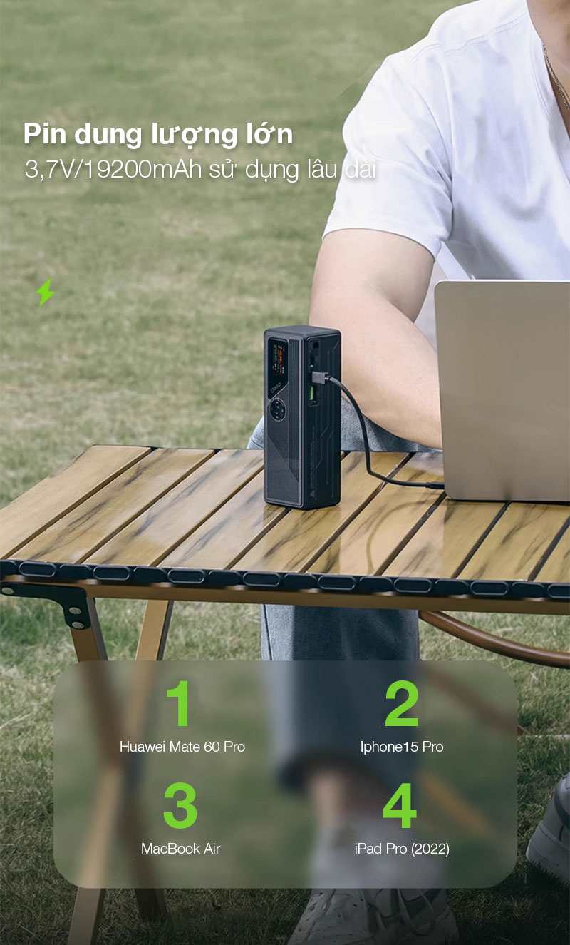 - Pin dung lượng lớn 3,7V/19200mAh sử dụng lâu dài