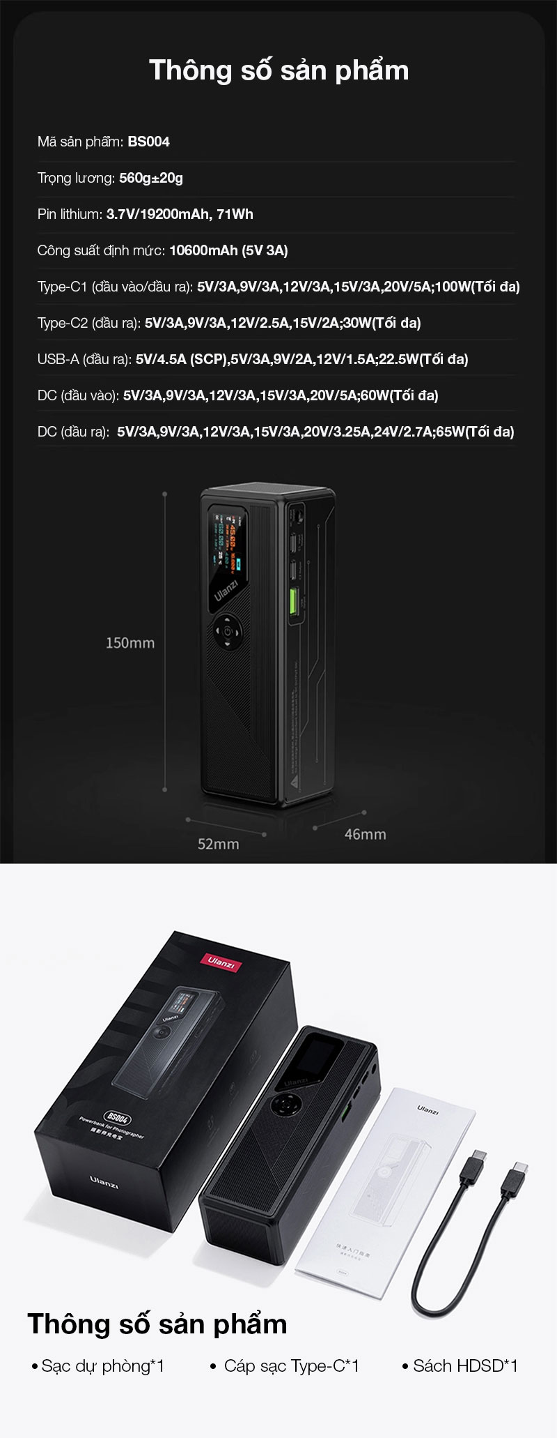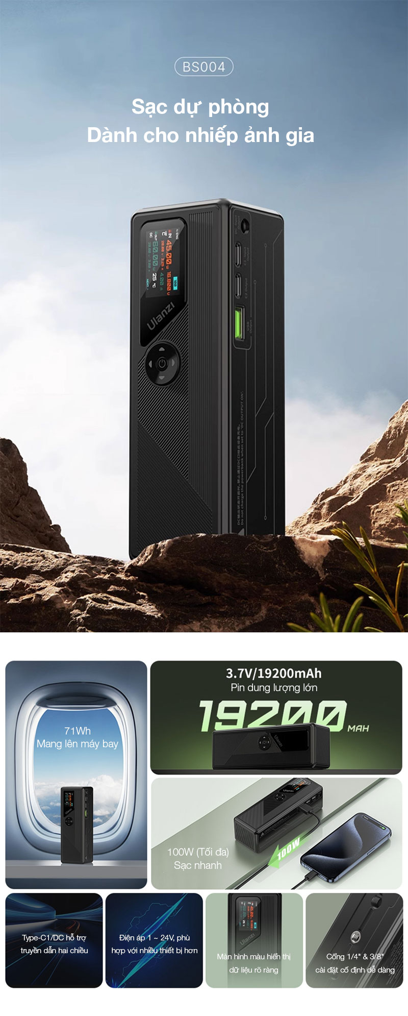 - Pin lithium: 3.7V/19200mAh, 71Wh