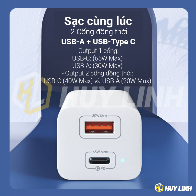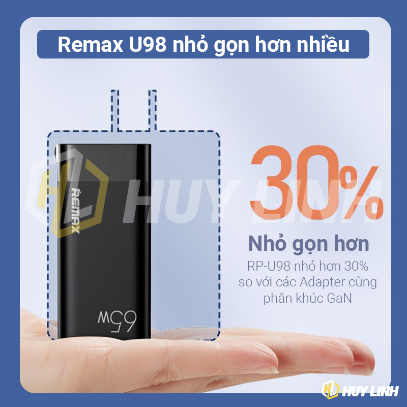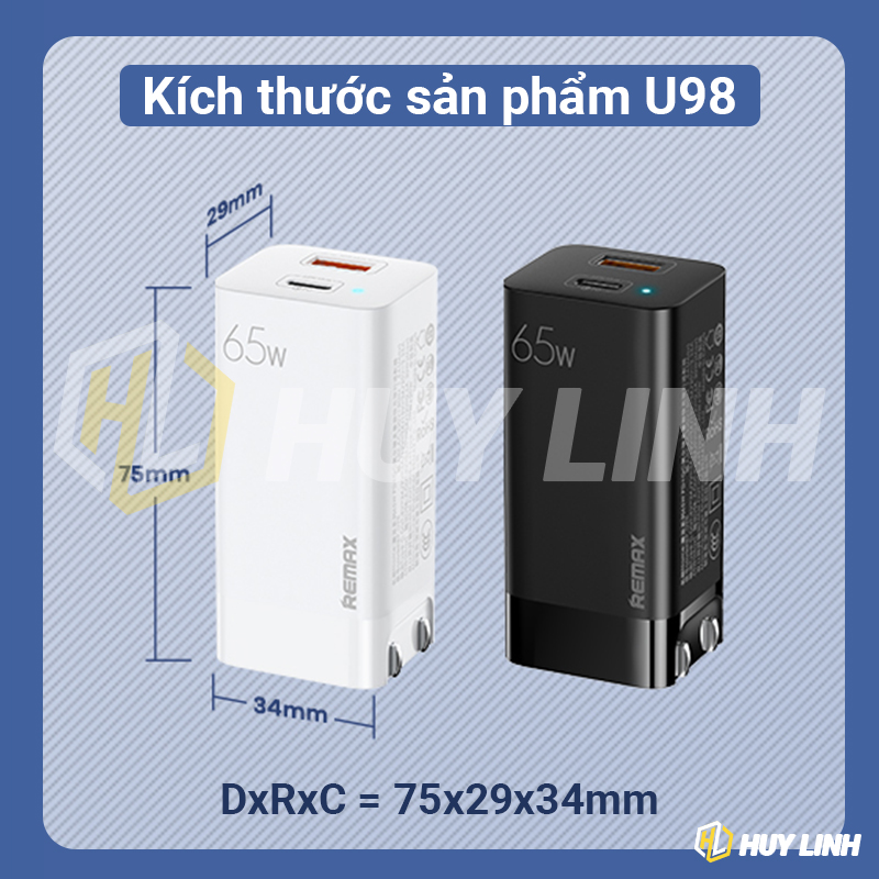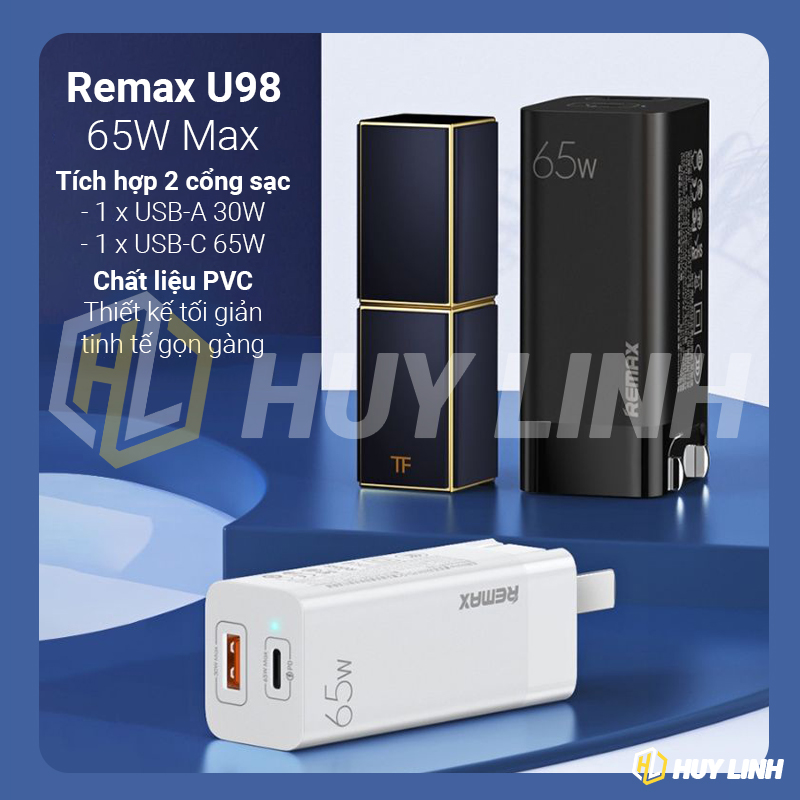 - Tên sản phẩm: Cóc Sạc Nhanh Remax RP-U98 GaN 65W tích hợp 01 cổng USB A và 01 cổng USB C