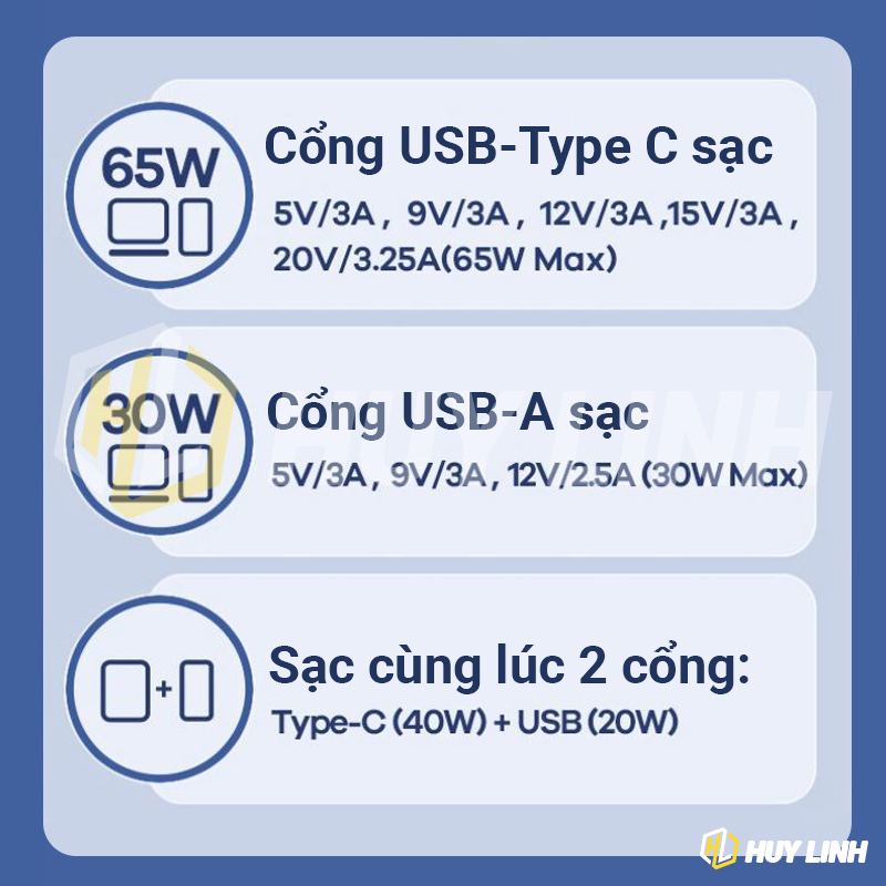 - USB-C: 5V-3A, 9V-3A, 12V-3A, 15V-3A, 20V-3.25A (65W Max)