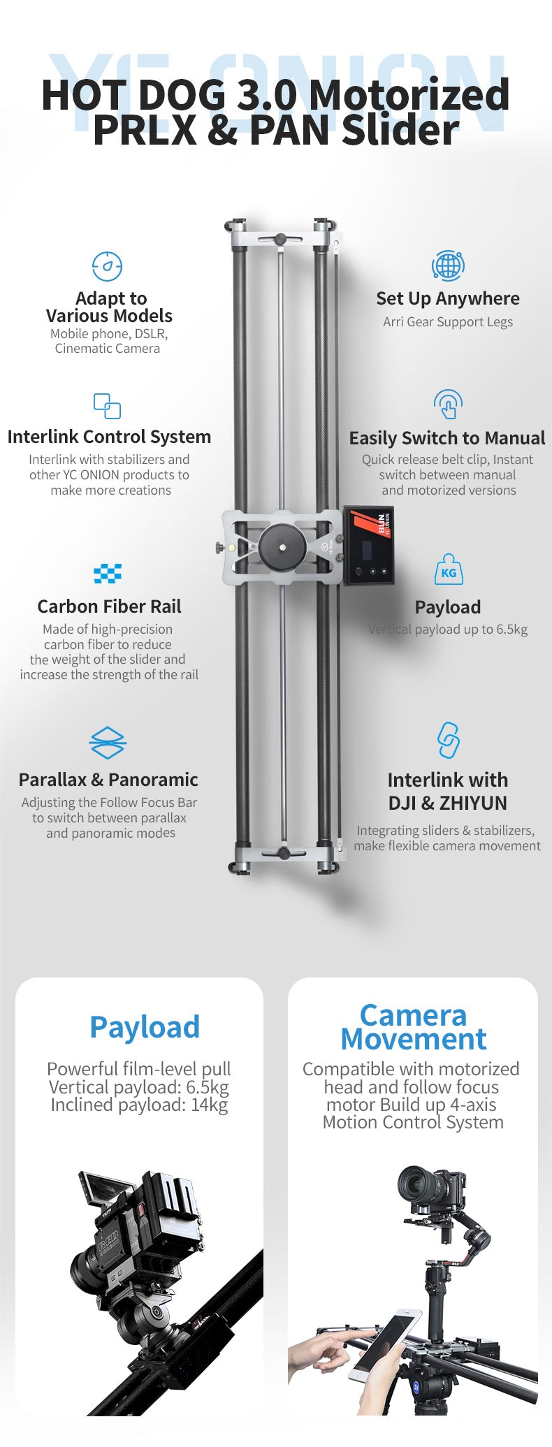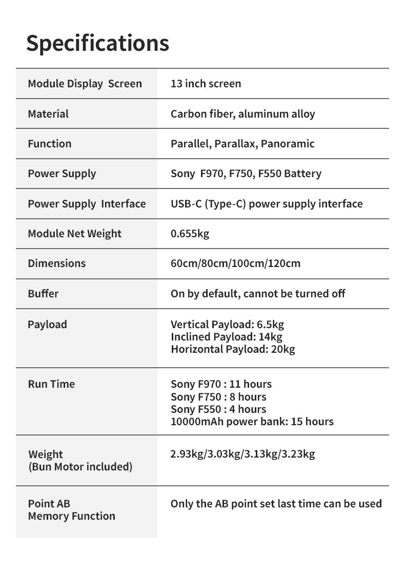 - Tải trọng: Dọc 6.5kg, Dốc 14kg, Ngang 20kg