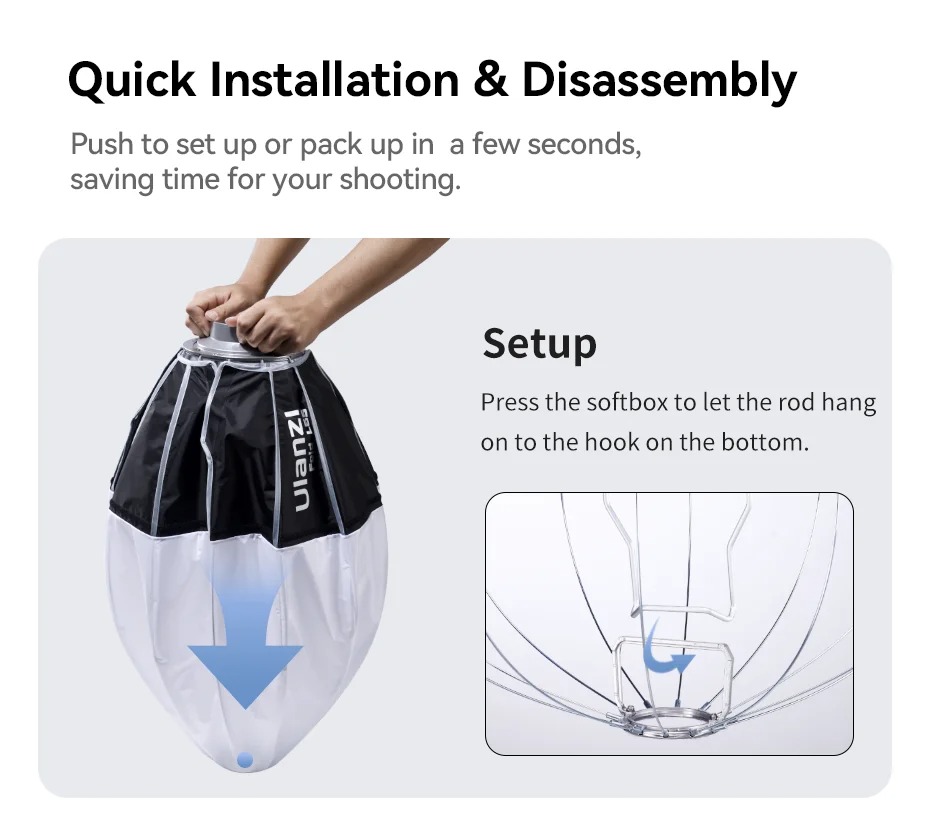 - Lắp đặt và tháo rời nhanh chóng chỉ cần nhấn để dựng hoặc thu gọn trong vài giây, tiết kiệm thời gian chụp ảnh.