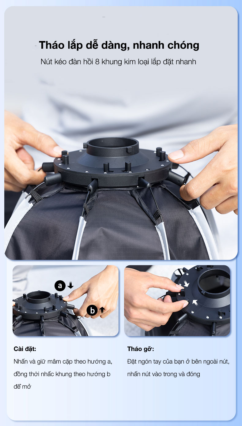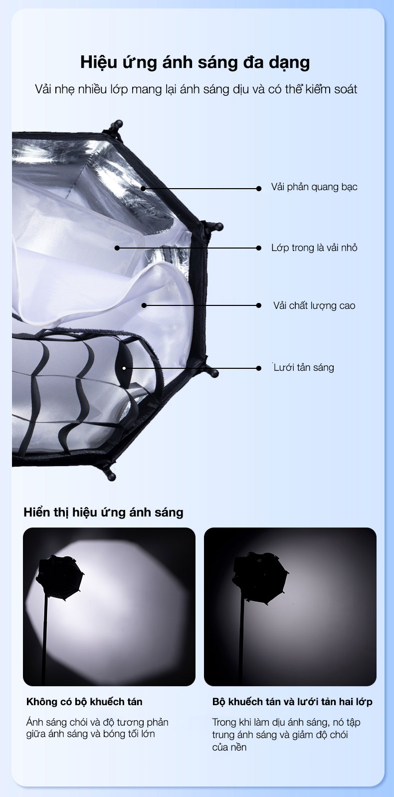 - Sinh ra cho tính linh hoạt : Bộ khuếch tán và lưới kép mang lại ánh sáng mềm mại và đều.