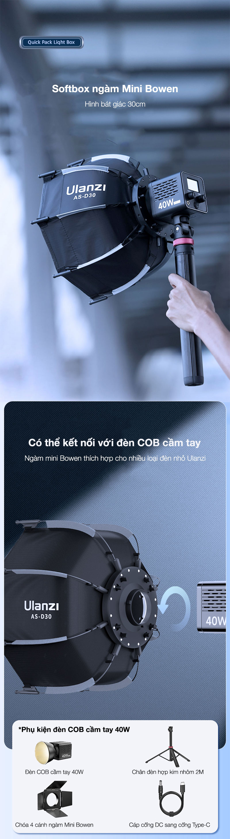 - Kết hợp hoàn hảo cho đèn COB : Giá đỡ Mini Bowens, lý tưởng cho nhiều loại đèn từ Ulanzi.