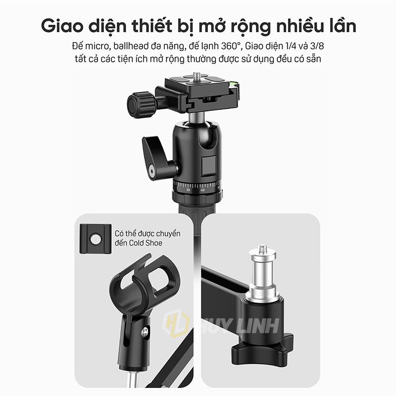 - Chiều cao trục trung tâm lên tới 70cm, không giới hạn chụp từ mọi góc độ hoặc khoảng cách. Cánh tay mở rộng siêu dài 75cm, điều chỉnh ba đoạn cho bạn thỏa sức sáng tạo nội dung.